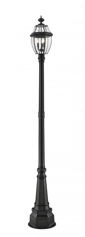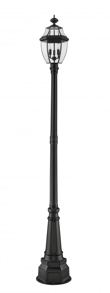 This three light, broad-based outdoor post mounted fixture adds a classic silhouette to the lighting in your patio, deck or other outdoor area. With its candelabra composition, the lamp provides soft, effective illumination. A multi-sided clear beveled glass shade has a black steel frame, creating an elegant impression.