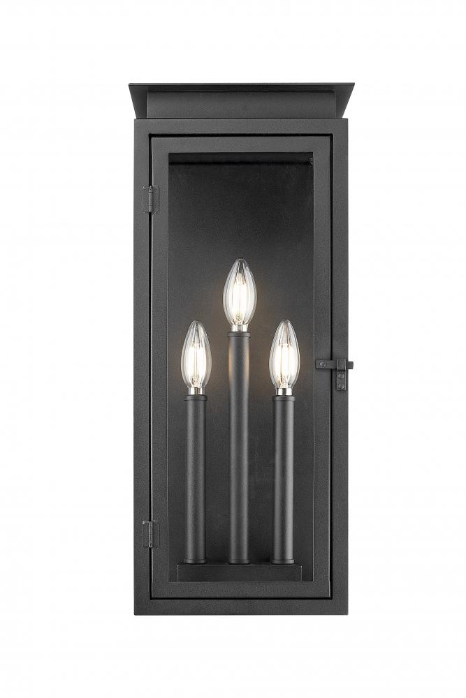 Offer stylish character to your exterior with this transitional three-light outdoor wall light. A lantern profile is paired with a layered cap and stepped trim, all on a coastal black finish that adds excellent durability. The lantern includes candelabra light within and glass panels for excellent illumination.