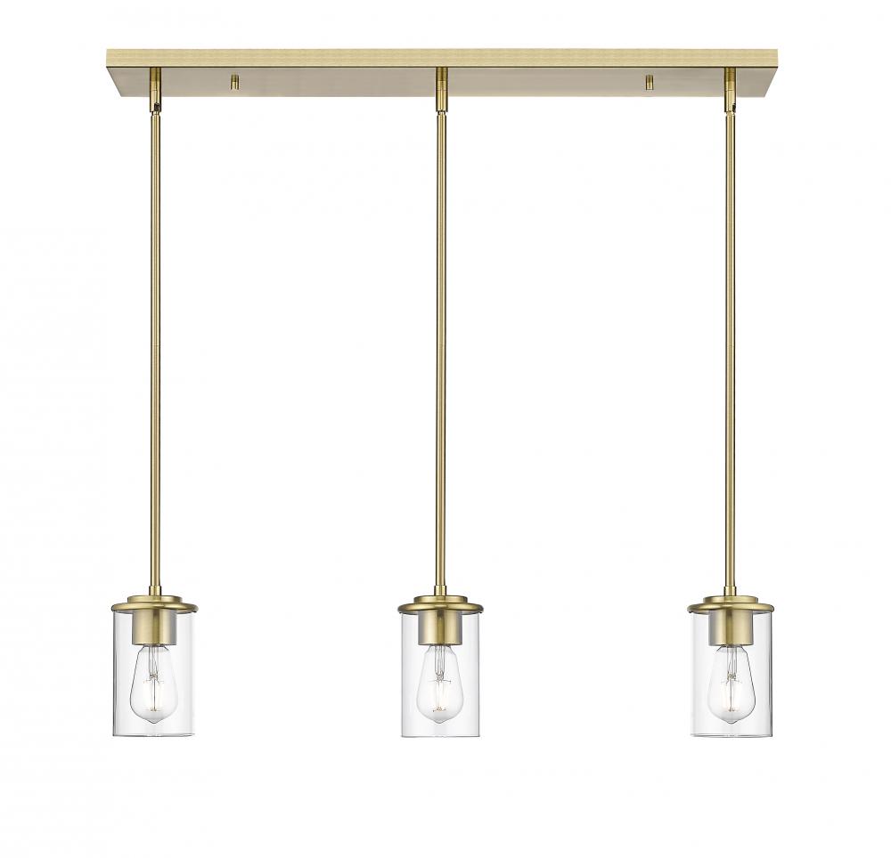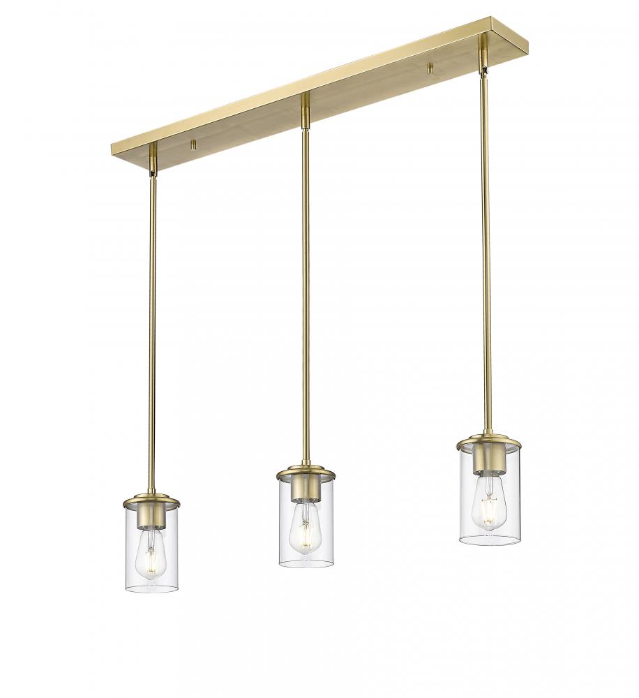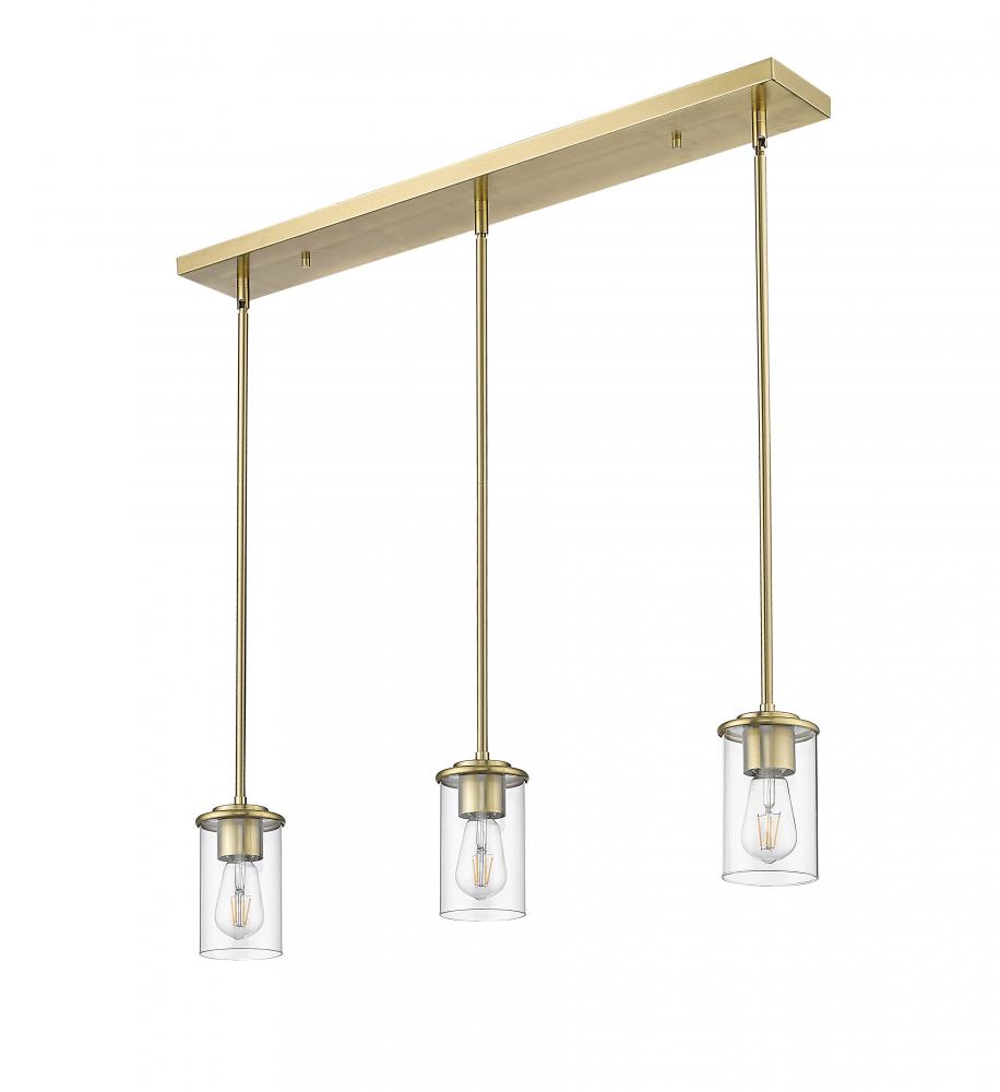 Set the tone in a warm, welcoming kitchen or dining room with the sleek, modern style of a three-light linear pendant. Ideal over an island or breakfast nook, it boasts a classic silhouette with a rectangular canopy and straight suspension, all in a warm luxe gold finish. Each of three lights is surrounded with a cylinder of clear glass, allowing for bright, true illumination.