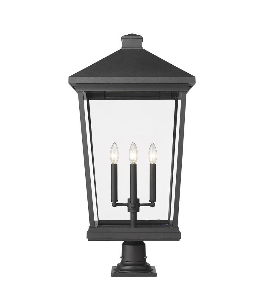 Embellish a custom garden space or walkway with a hint of village charm. This four-light outdoor pier-mounted light fixture creates a sophisticated and stylish form of ambient lighting and elevates the d?cor level to match carefully planned spaces. From the Beacon collection, this light offers a matte black finish aluminum housing unit dressed up with clear beveled glass that offers a peek-a-boo view of a romantic candelabra-style bulb base.