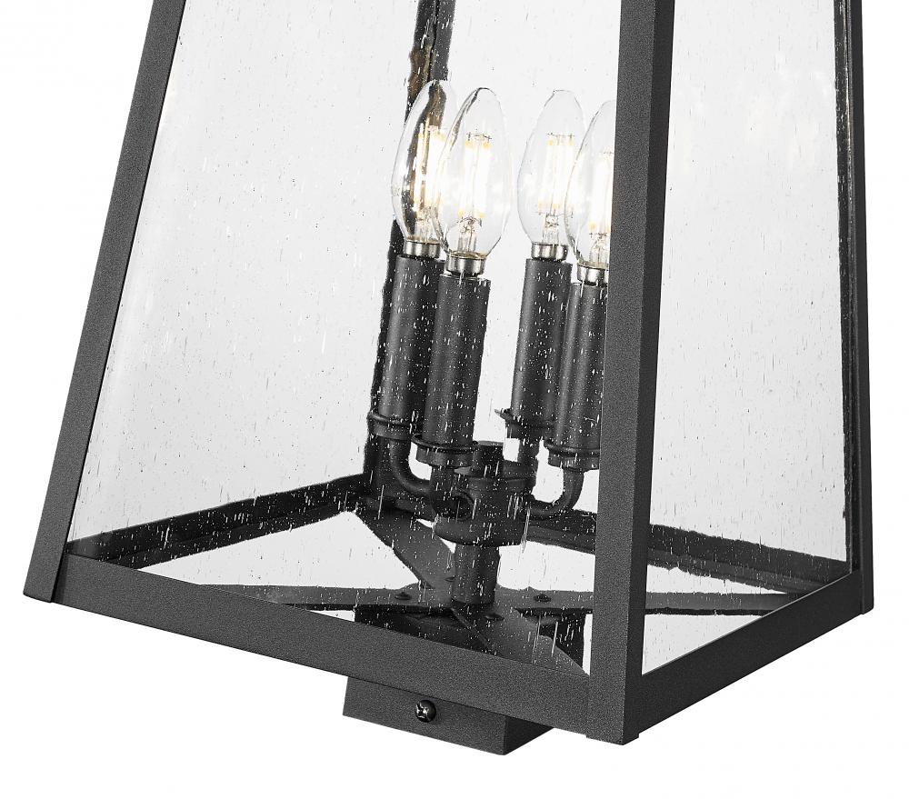 A classic lantern-inspired silhouette and design greets exterior gardens and walkways with ambient illumination as this modern four-light outdoor post mount fixture promises a sophisticated aesthetic. Top a post with this fixture featuring Coastal black painted aluminum with clear seedy glass panels, and a charming candelabra cluster base inside. This dimmable outdoor light tops the post of your choice and raises the level of elegance in a custom outdoor setting.