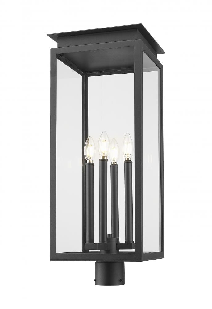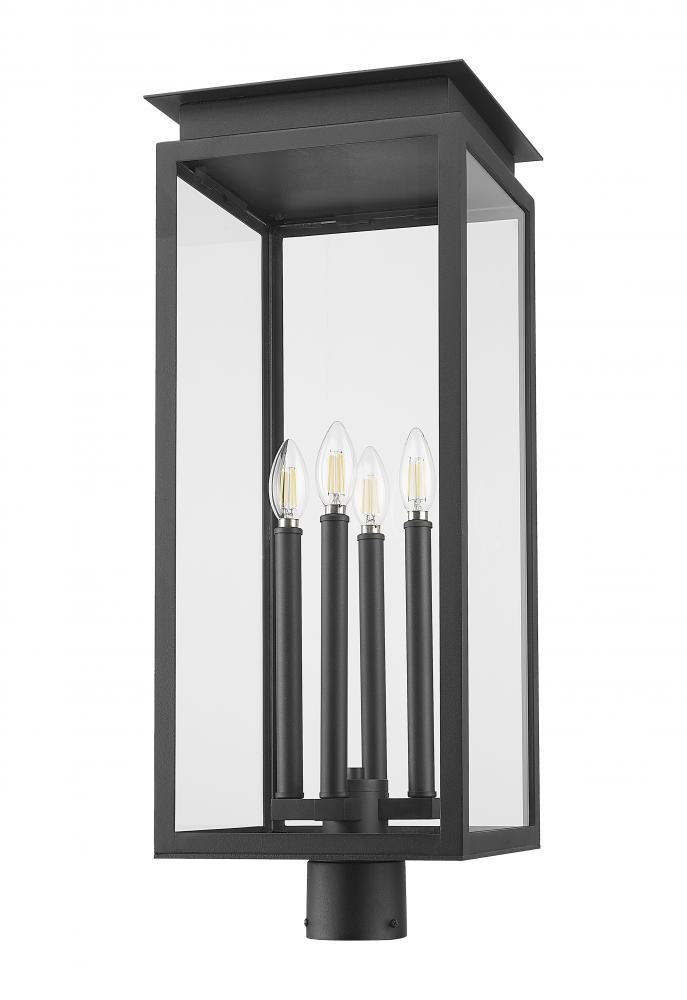Upgrade your deck or patio with this transitional four-light outdoor post mount light fixture. Its squared lantern silhouette imparts clean, classic flair, while a timeless coastal black finish offers excellent durability. Candelabra lamping is accessed with a latching glass door, while a layered cap and stepped trim offer the perfect dose of dimensionality.