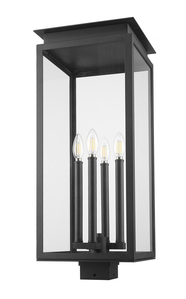 Encourage a chic look and feel along a front walk or garden path with this transitional four-light outdoor post mount light. It features a central candelabra cluster set behind glass panels for excellent illumination, and includes a layered cap and stepped trim that bring a sense of luxury and texture. The fixture is complete with a durable coastal black finish, designed for lasting beauty.