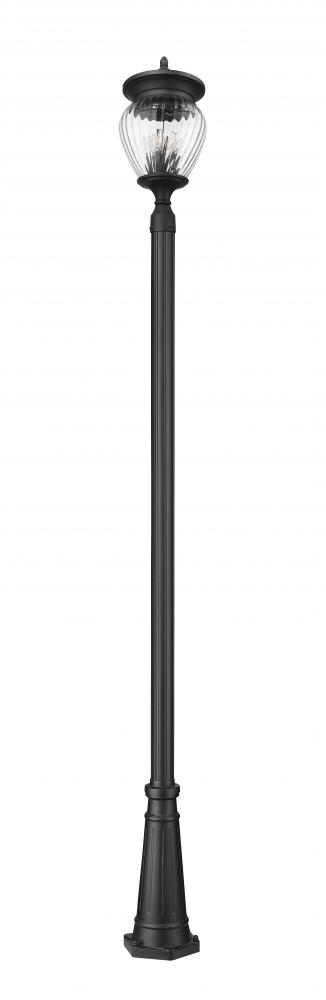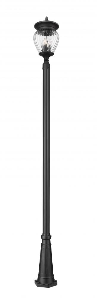 Exterior spaces deserve decadent lighting with a soft glow and sleek style. This four-light outdoor post-mounted fixture is a romantic feature, with a clean-lined pole paired with ornate accents that include a clear ribbed glass shade. With a smooth Coastal black paint finish, its dramatic impact is softened with charming gallery style and a gently contoured post.