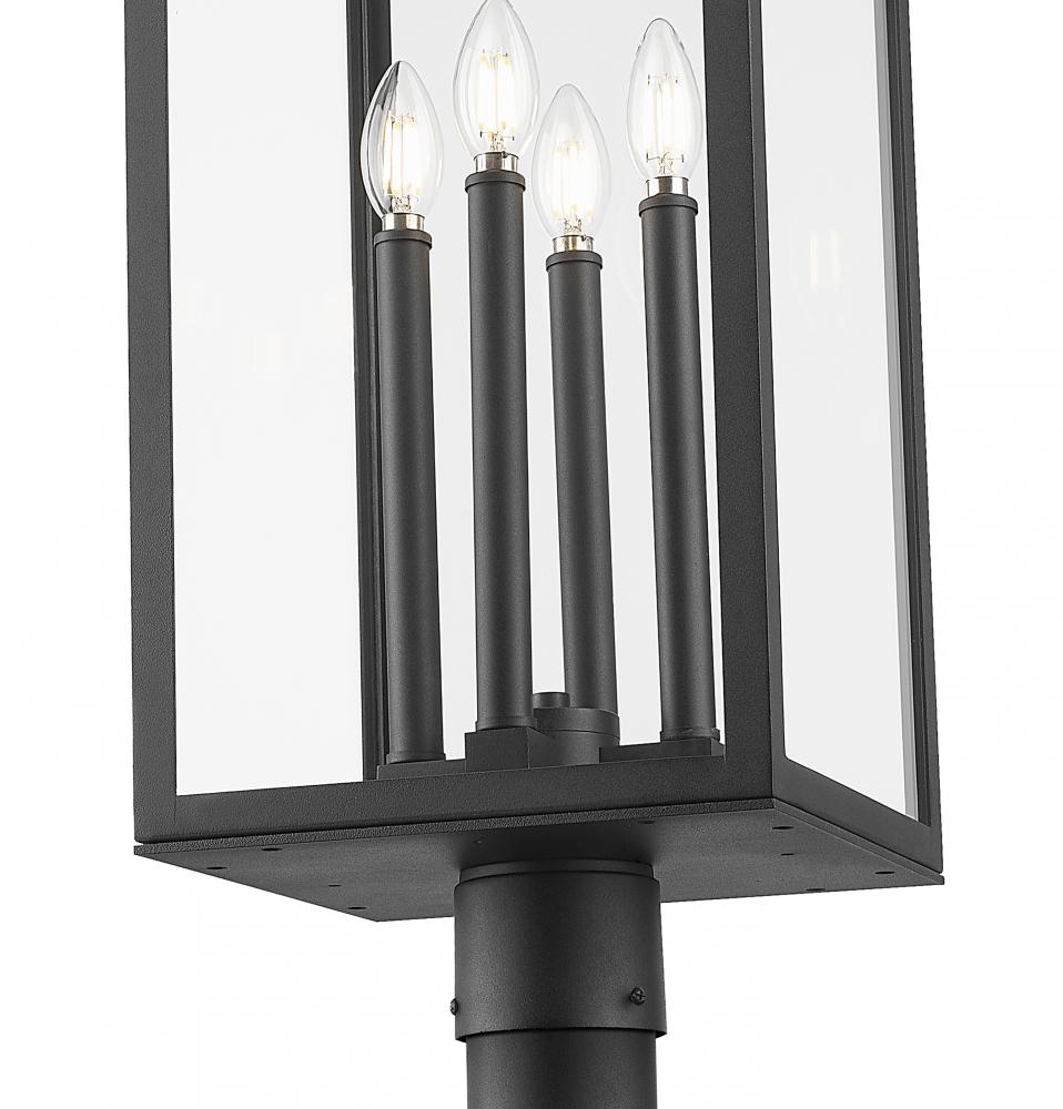 A decorative post adds flawless character to this transitional four-light outdoor post mount light fixture. Ideal for establishing curb appeal along a front walkway, the lantern style design impresses with a coastal black finish and glass panels that include a latching door for easy access to candelabra lamping within.