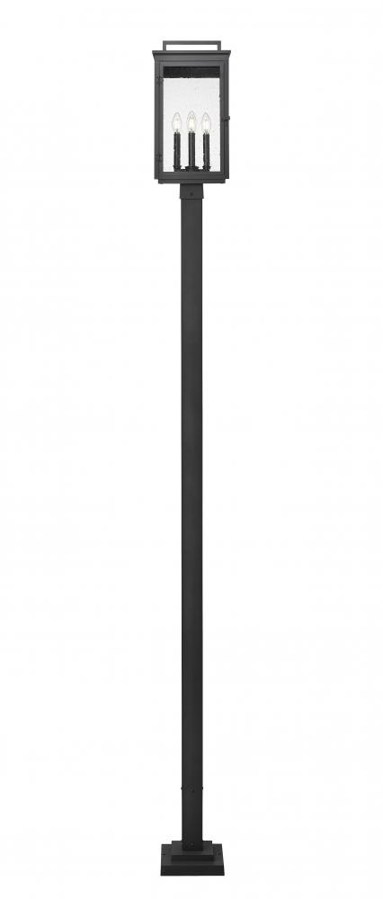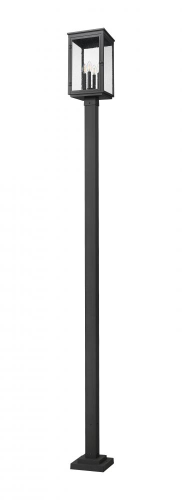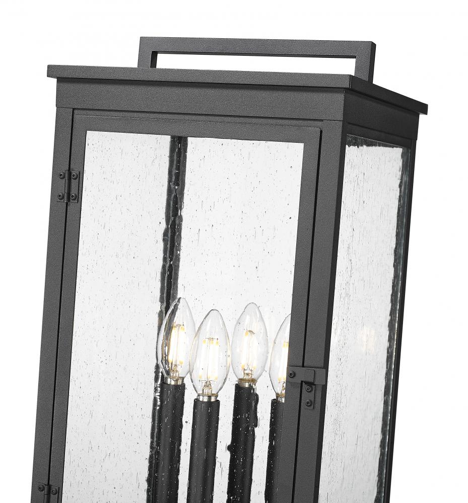 A charming handle reinforces the character-rich depth and details featured on a traditional Mission four-light outdoor post mount light fixture. Perfect for creating curb appeal, it features a marine-grade sand black finish with subtle texture that adds dimensionality. The lantern includes candelabra lights and clear seedy glass that adds the perfect hint of texture.