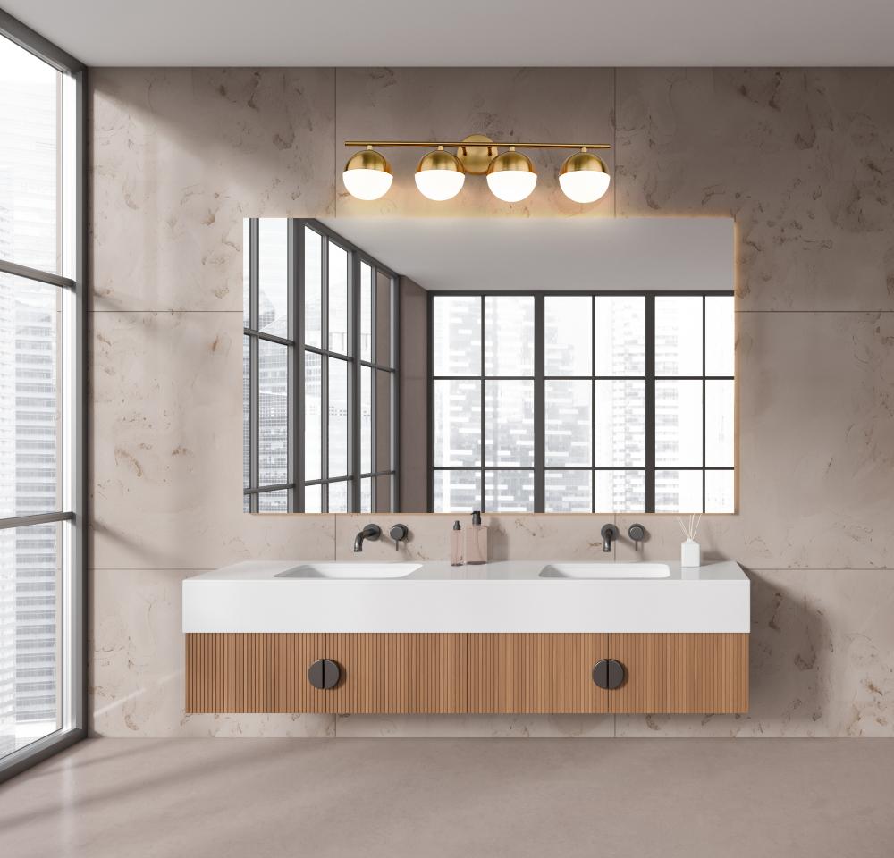 Introduce rich depth and character with the inviting modern gold finish featured on this mid-century four-light vanity bath light. Perfect for primary and guest en suites, it delivers soft, inviting illumination with opal glass orb shades, diffusing the light to create an alluring ambiance. A round tube arm and round wall plate complete the look with a sense of refined structure and definition.