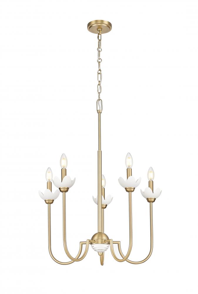 Vintage style resonated beautifully in every detail of this transitional five-light chandelier. Floral bobeches, in both white metal and clear glass, add charming presence in a kitchen, living area, or bedroom, while a modern gold finish adds sophisticated but approachable warmth and character.