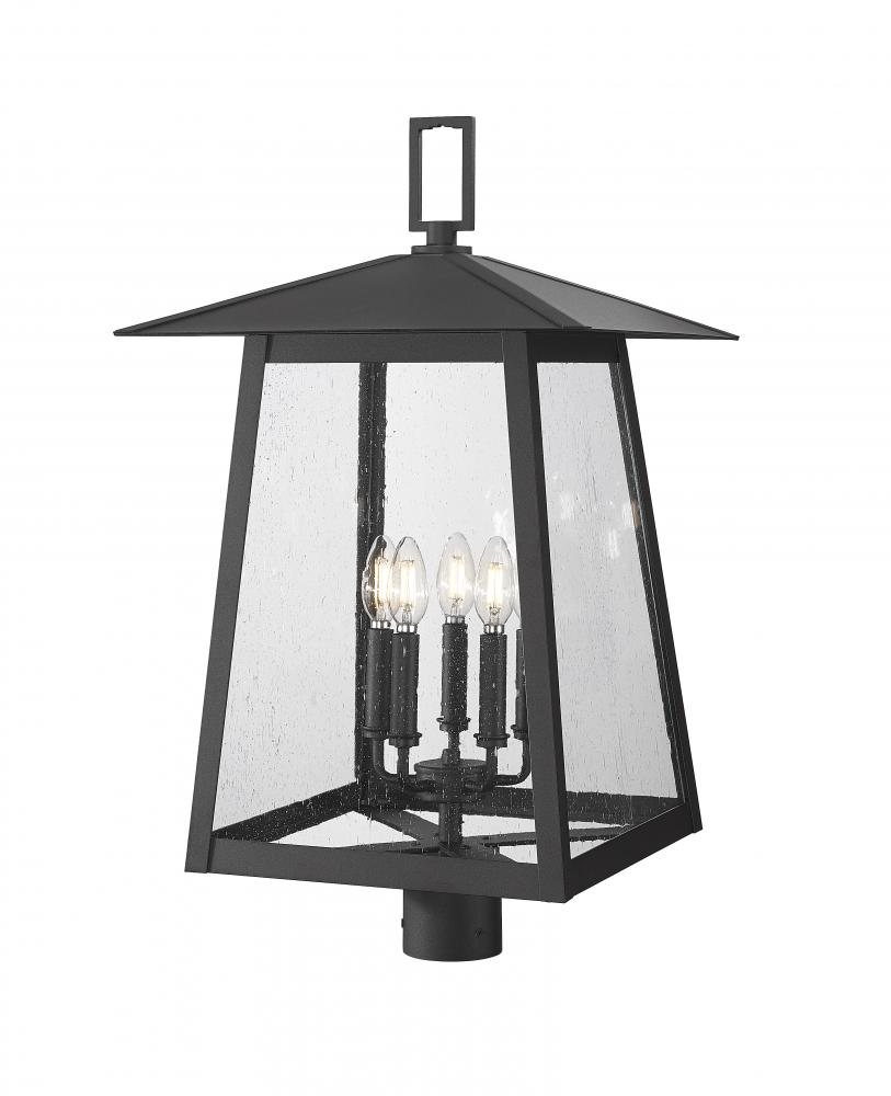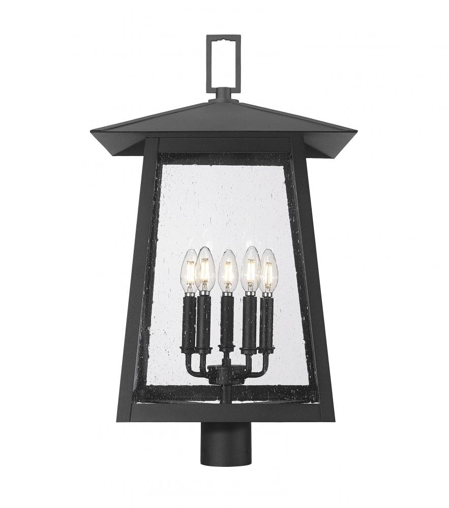 Showcasing a classic lantern-inspired silhouette to augment exterior gardens and walkways, this modern five-light outdoor post mount fixture promises a sophisticated aesthetic. Perfect for topping a post, this fixture features a Coastal black painted finish over aluminum, with clear seedy glass panels that offer vintage character. This dimmable outdoor light raises the level of elegance in a custom outdoor setting.