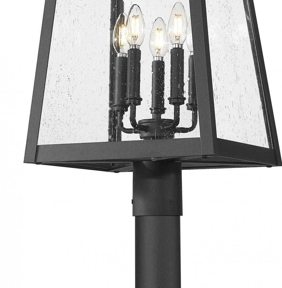 This five-light outdoor post-mounted fixture embellishes any setting as it offers soft, glowing illumination. Coastal black finishing complements aluminum construction, while seedy glass panels create the right dose of dimension and vintage depth. Its a dimmable fixture, ideal for setting the right ambiance in your gardens and landscaping.