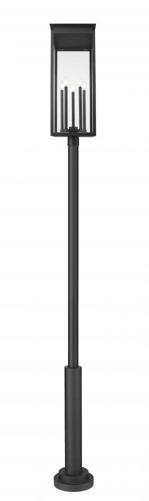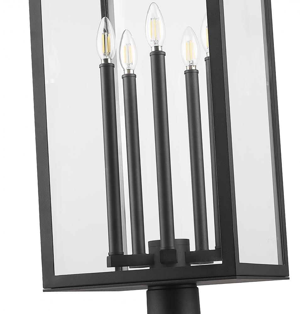 Create a warm and inviting glow across your front walk with this transitional five-light outdoor post mount light. Its squared lantern design is enhanced with a durable coastal black finish. Glass panels and a latching door provide access to candelabra lamping as this fixture provides compelling curb appeal.