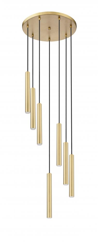 Choose approachability and modern sculptural allure with this contemporary seven-light LED chandelier. Its chic round canopy and streamlined, slim light housings feature an approachable and inviting modern gold finish. Its spiral fall of staggered lights creates an eye-catching focal point, perfect for your living or dining room.