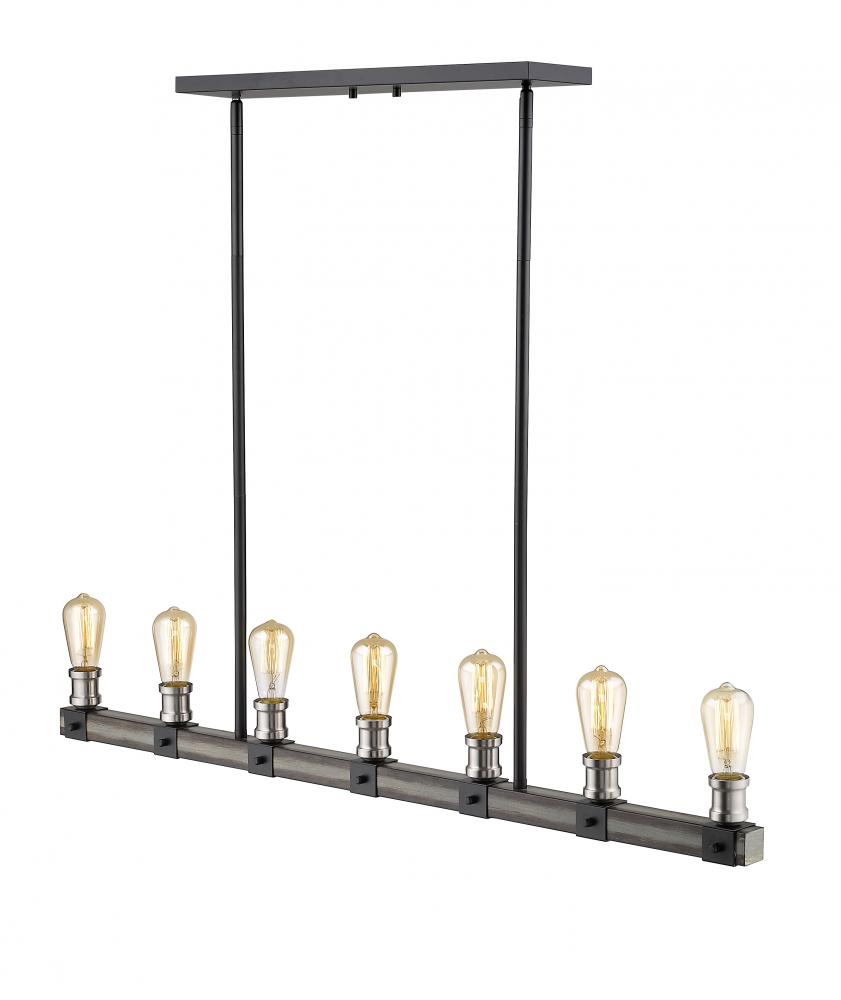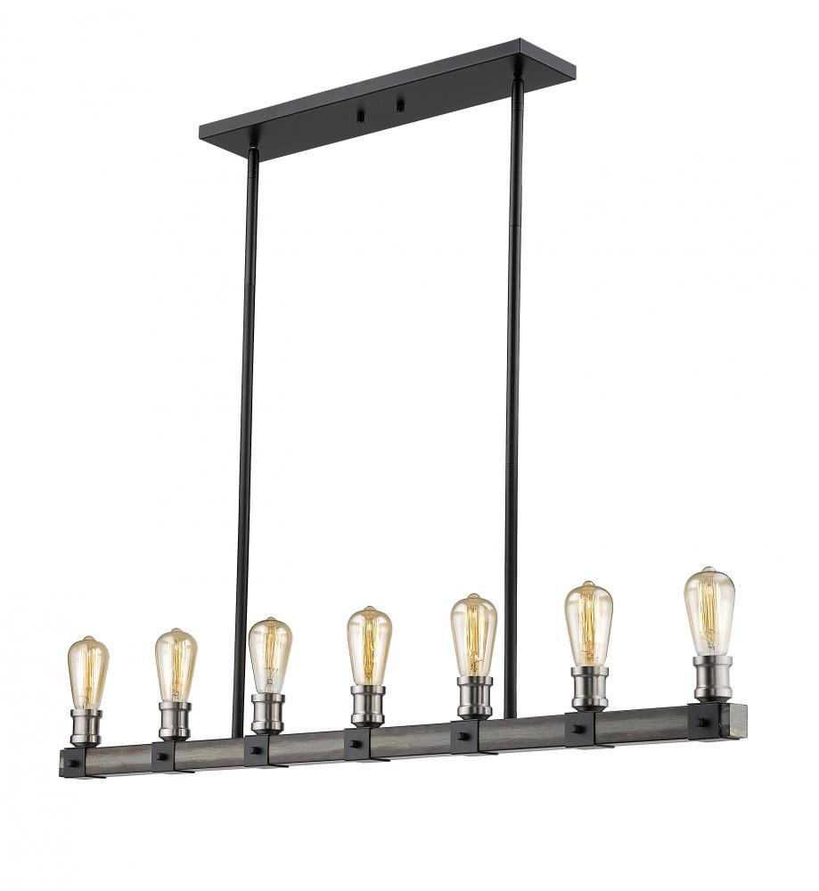 Create a stunning focal point above an elongated dining room table with this sleek seven-light pendant light. Designed out of faux barnwood, the clean lines of the frame are enhanced with an arched finish and adorned with exposed lightbulbs.
