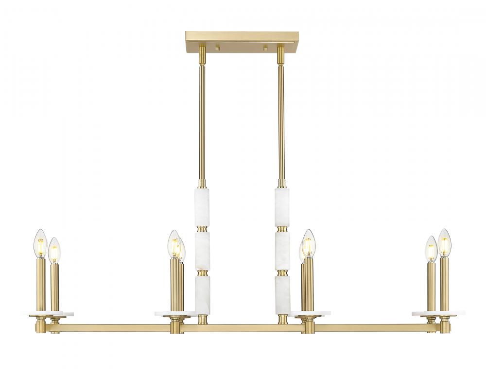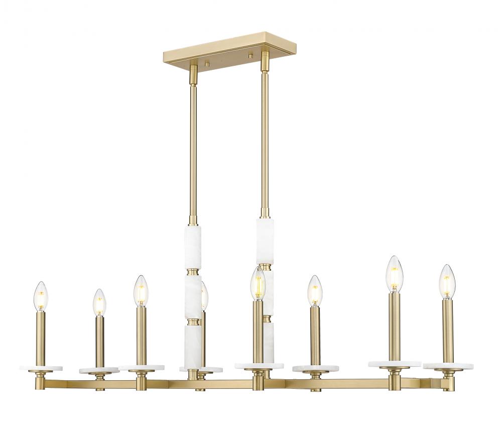Brilliant in form and golden in tone, this linear chandelier is built to impress. Eight alabaster globes float in a warm modern gold structure, casting a soft and even glow across long surfaces. Ideal for open layouts, it delivers elegant scale with a whisper of glamor.