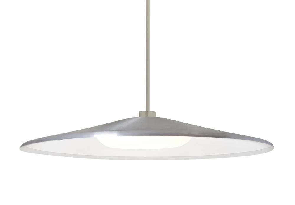 Our Swan employs a contemporary large-scale spun aluminum shade along with a blown glass toroidal diffuser, for a seductive inner glow combined with effective downlighting. The upper portion of the shade is painted in various color options, resulting in a design ideal for a diverse group of architectural spaces. The stem pendant fixture is equipped with an adjustable telescoping section, 4 connectable stem sections (3", 6", 12", and 18") and low Profile flat monopoint canopy. These stylish and functional luminaries are offered in a beautiful Satin Nickel finish.