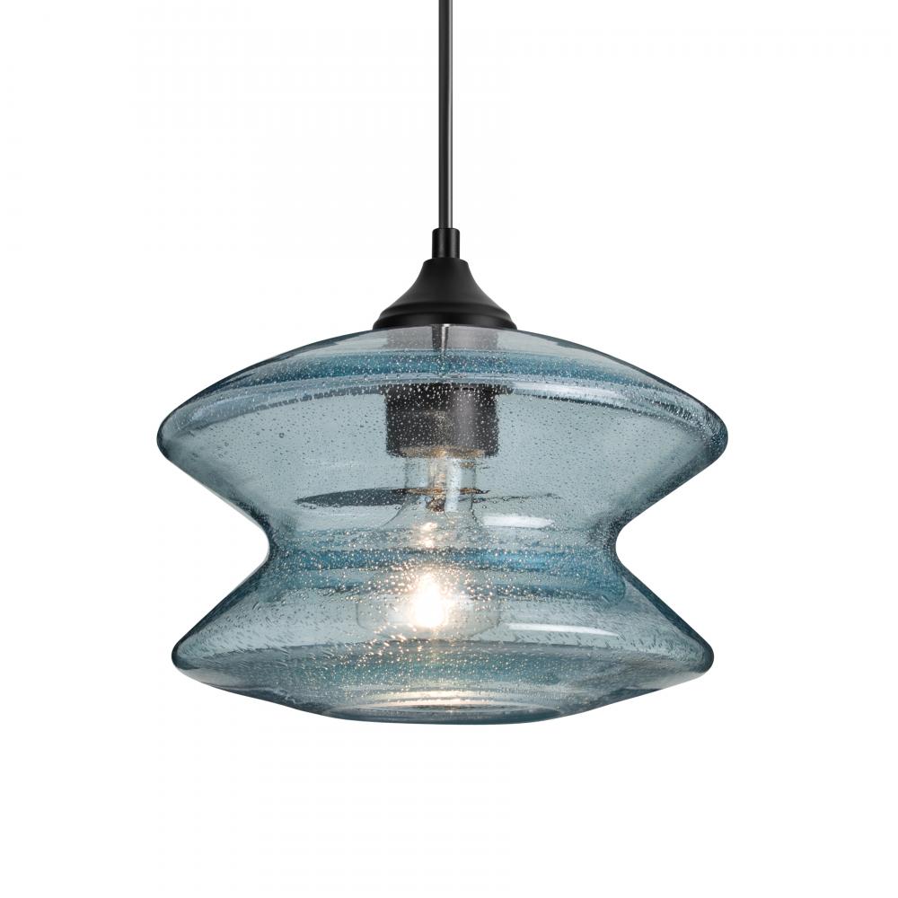 The Zen Blue Pendant is a transitional design composed of a transparent blue "Hour-Glass" shaped glass , with an interesting bubble pattern blown randomly throughout the glass The pleasing play of light through the shade's bubble accents makes for a striking affect, created by the exposed light source positioned inside the shade. The cord pendant fixture is equipped with a 10' SVT cordset and a low profile flat monopoint canopy, suitable for usage outdoors under covered ceiling. These stylish and functional luminaries are offered in a beautiful Black finish.