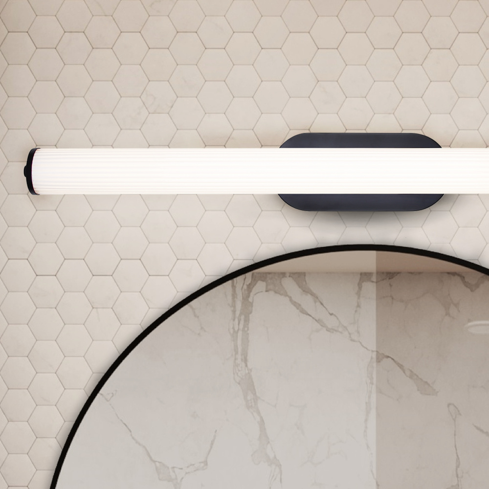 Sleek Modern Design – This LED Vanity Light features a striking black finish and glossy white ribbed glass, creating a clean, contemporary look. Its bold yet minimalist design effortlessly enhances modern and coastal-inspired bathrooms.