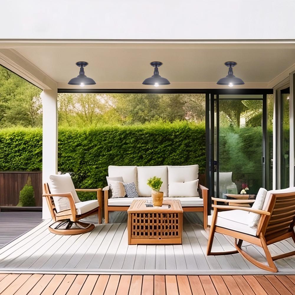 Vintage-Inspired Elegance: The flush mount light's classic black finish and wide shade design add a timeless rustic look to your outdoor spaces.