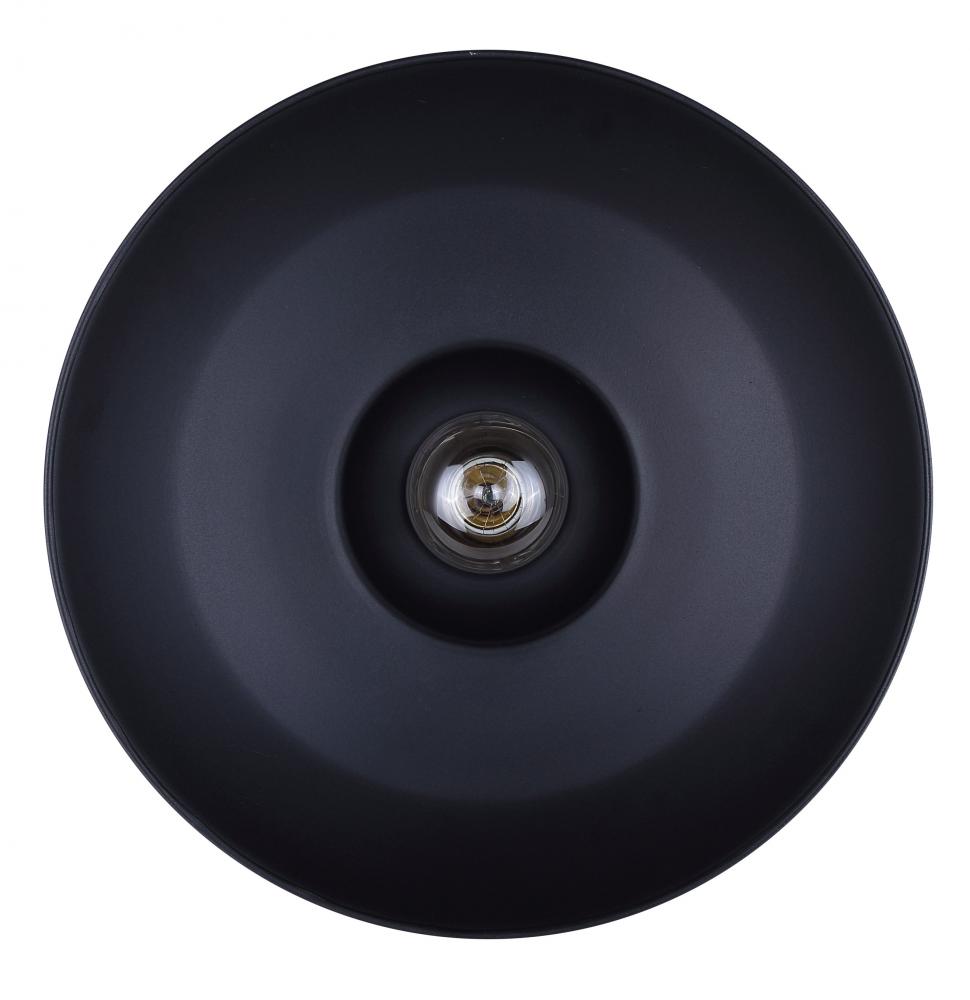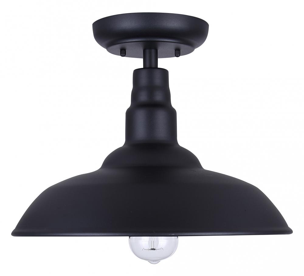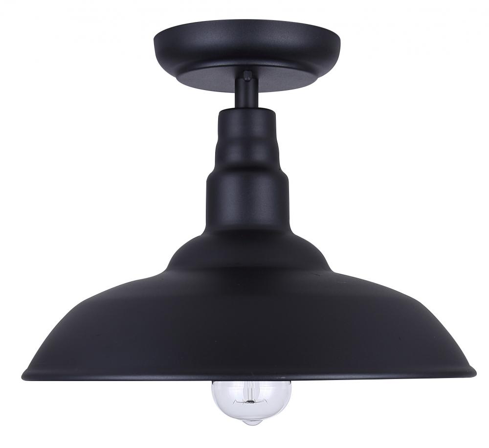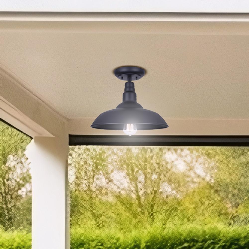 Illuminate your outdoor space with the Valec Outdoor Flush Mount Light, where classic style meets modern durability. This fixture's sleek black finish and broad shade are reminiscent of vintage farm lights, providing a blend of nostalgia and contemporary charm. Designed to affix snugly against any exterior ceiling, it casts a wide, welcoming glow ideal for porches, verandas, or any covered outdoor area.The Valec light fixture is designed for outdoor use, with a sturdy construction that holds up against varying weather conditions. It is equipped to house a 60W Type A bulb (not included), offering both bright and energy-efficient lighting. With its country rustic aesthetic, this light brings a warm ambiance to your exterior spaces, making it more than just a lighting choice—it's an enhancement to your home’s overall appeal.