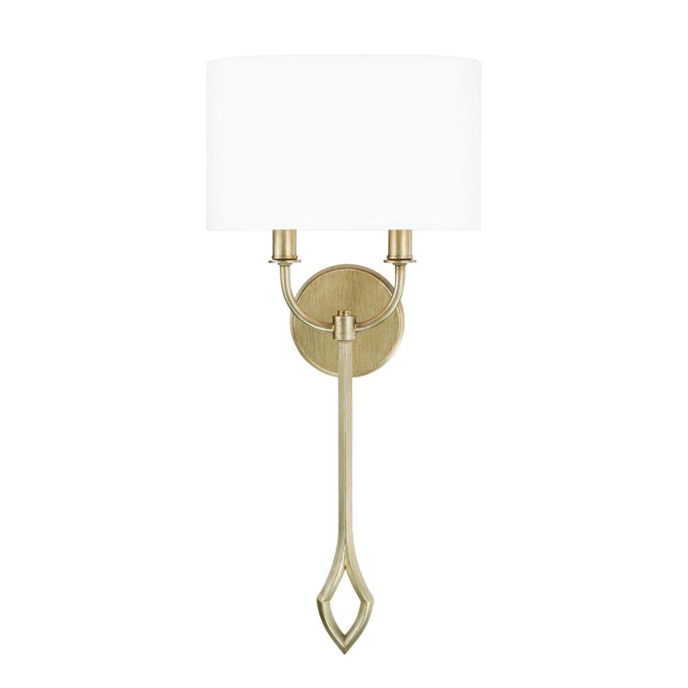 DETAILS: White fabric racetrack-shaped oval shade and sculpted silhouette are supported by a two-light sconce frame with an eye-catching sparkle from the Brushed Champagne finish.
