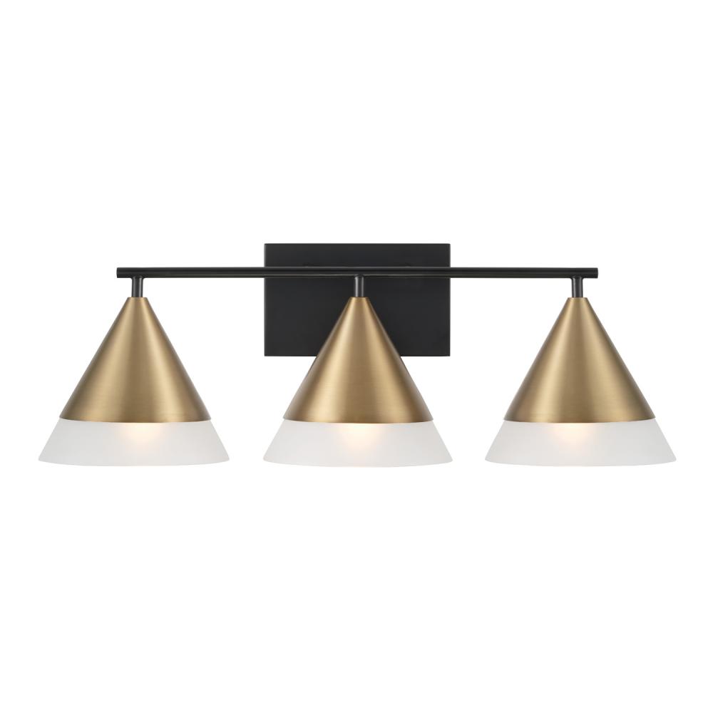 Create striking elegance in any powder room with the Avant 3-Light Vanity. The pointed Aged Brass metal shades widen to slightly translucent Frosted Glass to create an all-around stunning glow. Finished with Matte Black details, this luminaire evokes a distinct style.