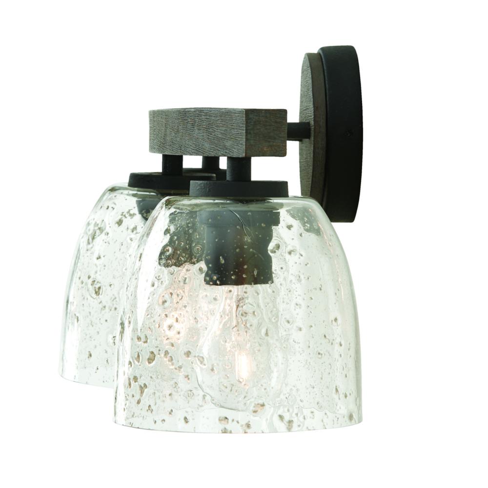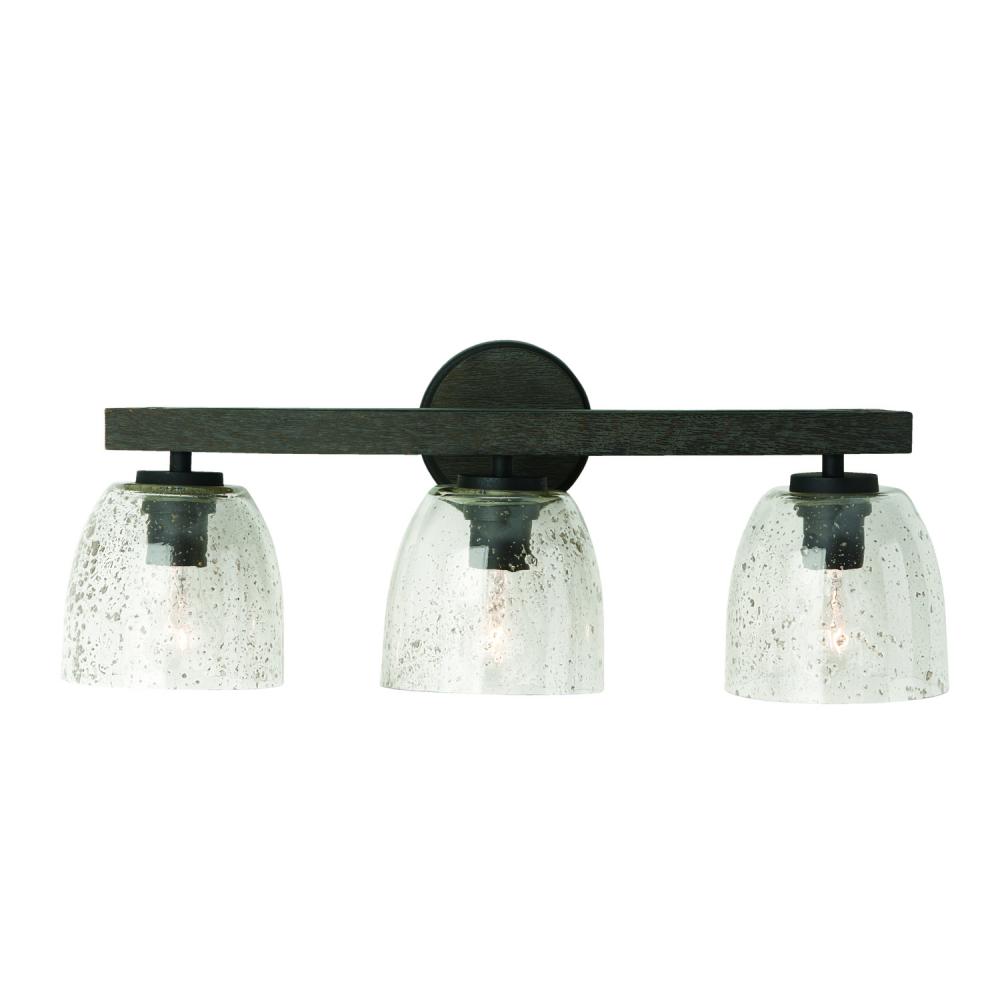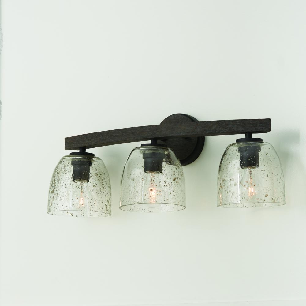 24.5"W x 9.5"H 3-Light Vanity in Carbon Grey and Black Iron with Stone Seeded Glass Handcrafted of Wire-Brushed Mango Wood