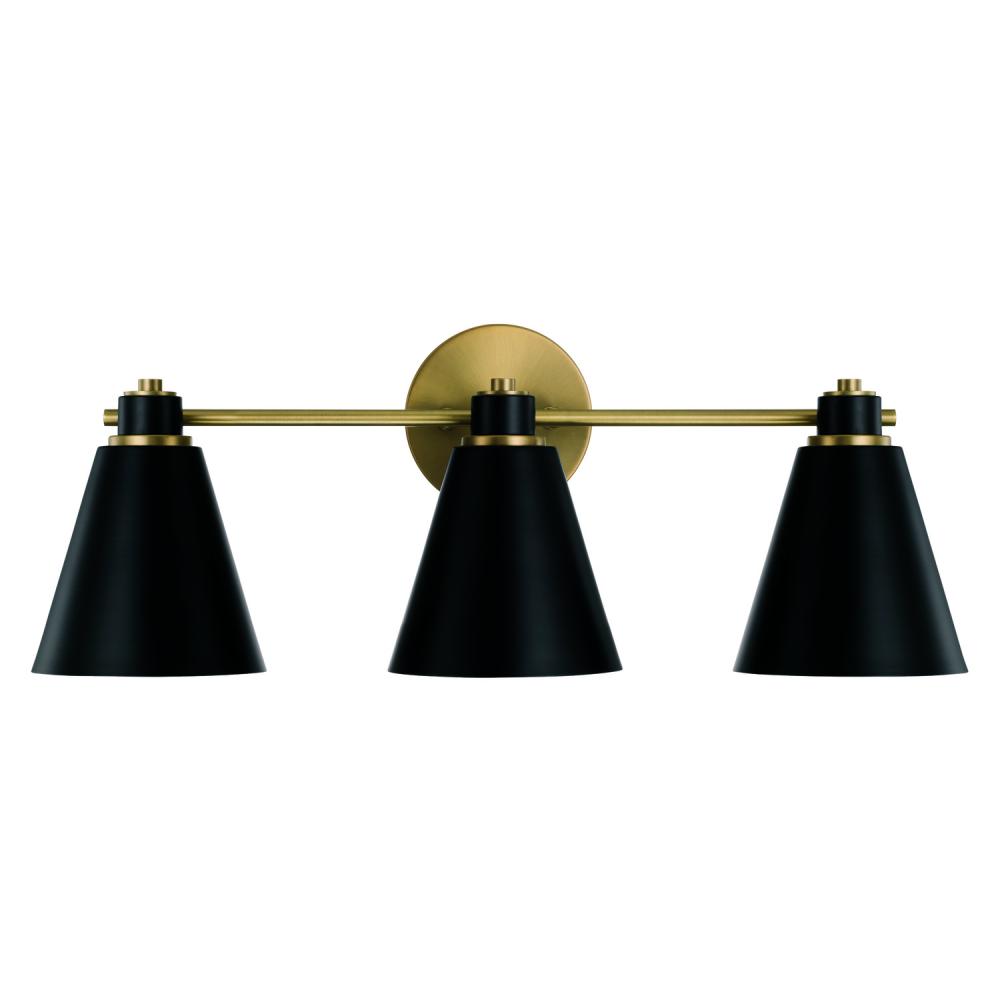 24"W x 9"H 3-Light Vanity in Aged Brass and Black Metal Shade with White Interior