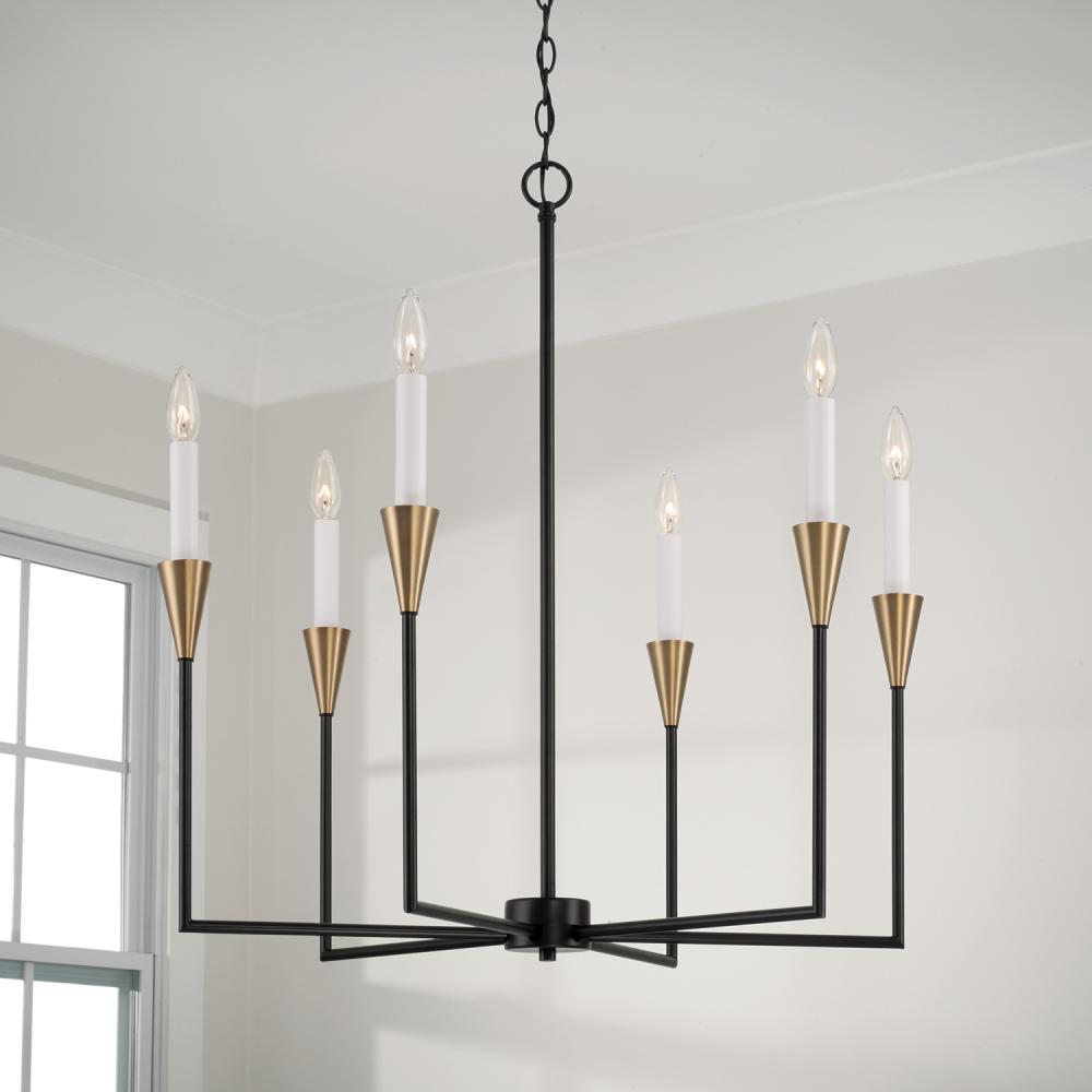 Create striking elegance with the Avant Small Chandelier. The pointed Aged Brass bobeches and squared Matte Black arms evoke a stunning, distinct style, while the interchangeable Aged Brass or Matte White candle sleeves offer a tailor-made feel.
