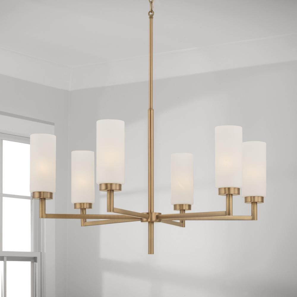 Sleek forms and modern contours create the Alyssa 6-Light Pendant. The elongated Faux Alabaster glass shades deliver earthy, elegant style, while the Aged Brass finish gives a nod to mid-century style.
