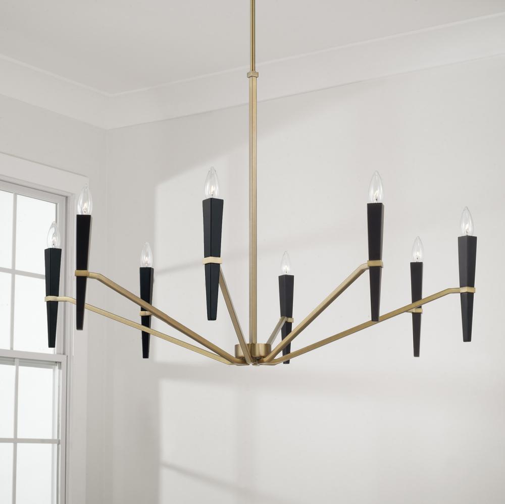 Bring striking style to any space with the Enzo Large Chandelier. The tapered, sculpted candlesleeves appear to pierce the arms for a unique angular design, while the sleek Aged Brass and Black combination finish creates a refined, modern aesthetic.