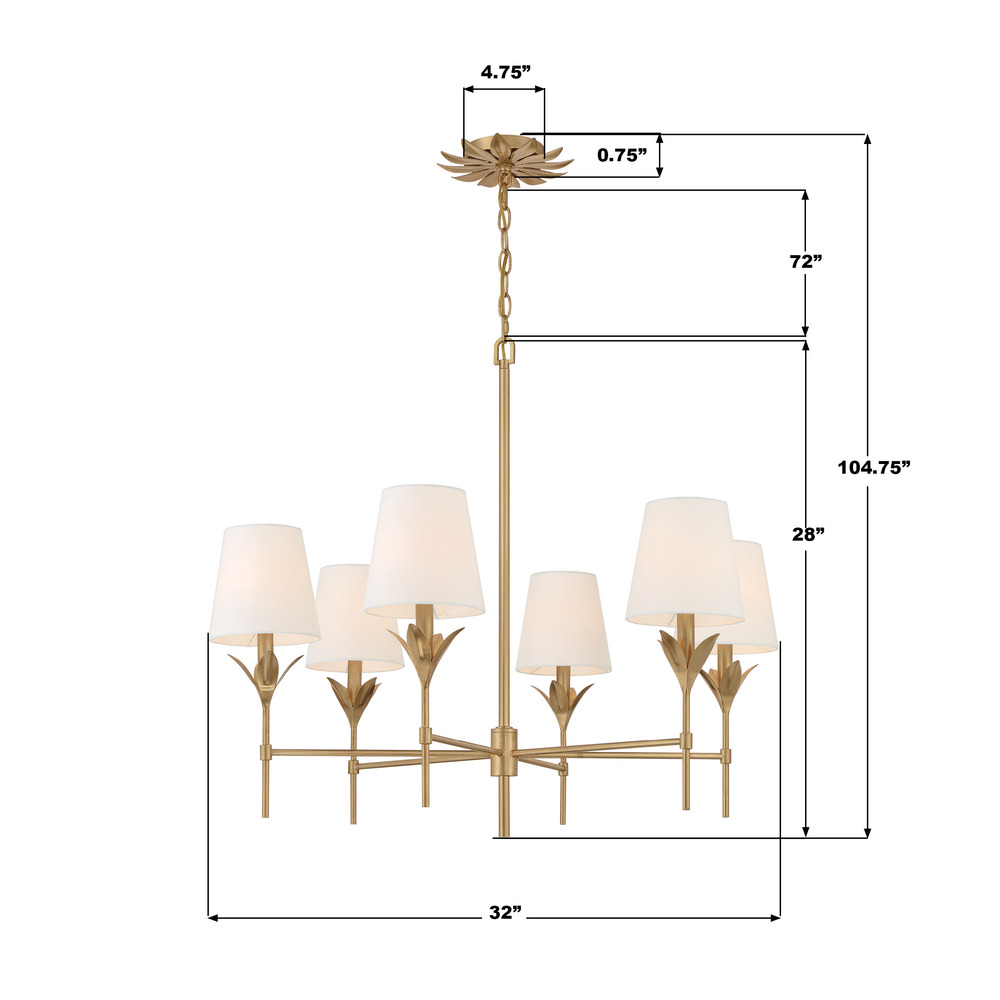 The Broche 6 Light Chandelier embodies a harmonious blend of traditional and modern elements. This fixture exudes timeless elegance with its candelabra-style frame and white linen shades. The layered wrought iron leaves create a stunning and functional display of light. Whether in a bedroom, living area, or kitchen, this chandelier adds a touch of refined glamour to any space, making it perfect for transitional and modern designs.