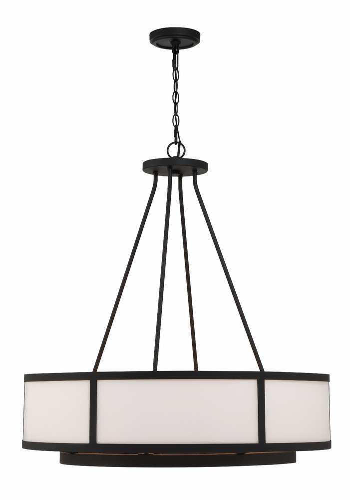 Showcasing a classic drum pendant, the Bryant is crafted with a white glass shade and black steel frame. The outer drum surrounds an inner suspension of candelabra sockets. The contrasting materials and bold graphic lines provide a design-driven style and a striking visual accent to many interior settings.