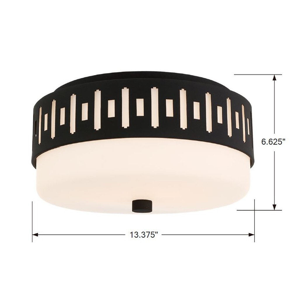 The white glass and geometric metal pattern of the Keaton ceiling mount is a functional and stylish addition to spaces that have low ceilings. The solid glass evenly diffuses the spread of light throughout the room, casting a soft glow.