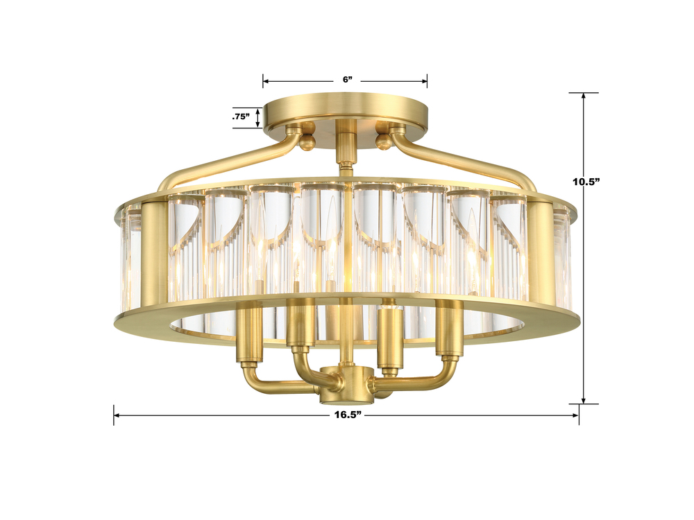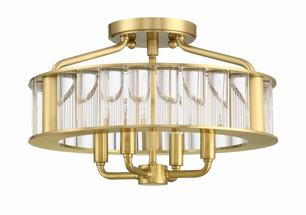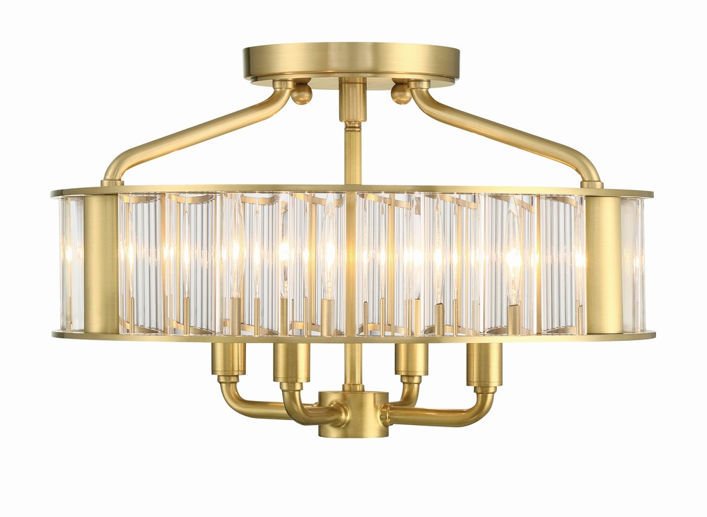 The Libby Langdon Farris Semi-flush light comprises solid thick glass rods and a sleek metal frame in a Vibrant Gold brushed finish. The open frame at the top and the bottom of the fixture is airy and light, while the generous diameter of the glass rods gives a substantial and luxurious feel. The center rod that holds the four candelabra light sections drops below the lower round frame just enough to add another dimension and visual interest. The soft slope of the top rods that connect to the upper canopy adds ease and elegance to the overall profile of the Farris semi-flush fixture. The Farris collection is a new contemporary take on a classic crystal chandelier.