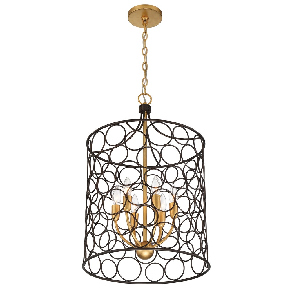 The open and airy drum-shaped pendant features bronze metal rings linked together to create a graphic pattern that stands out against the inner antique gold angular arms. This pendant is sure to inject a pop of personality into a room.