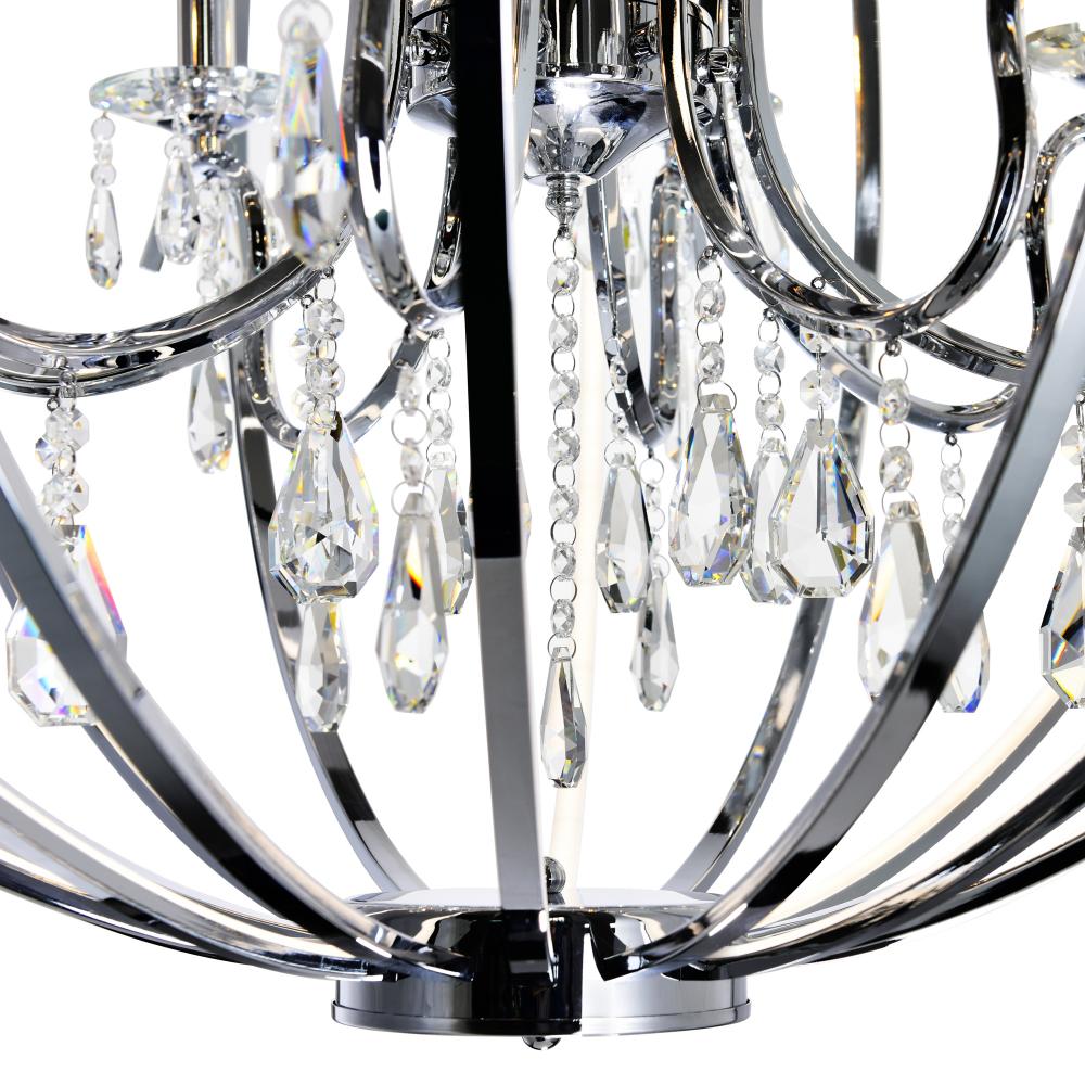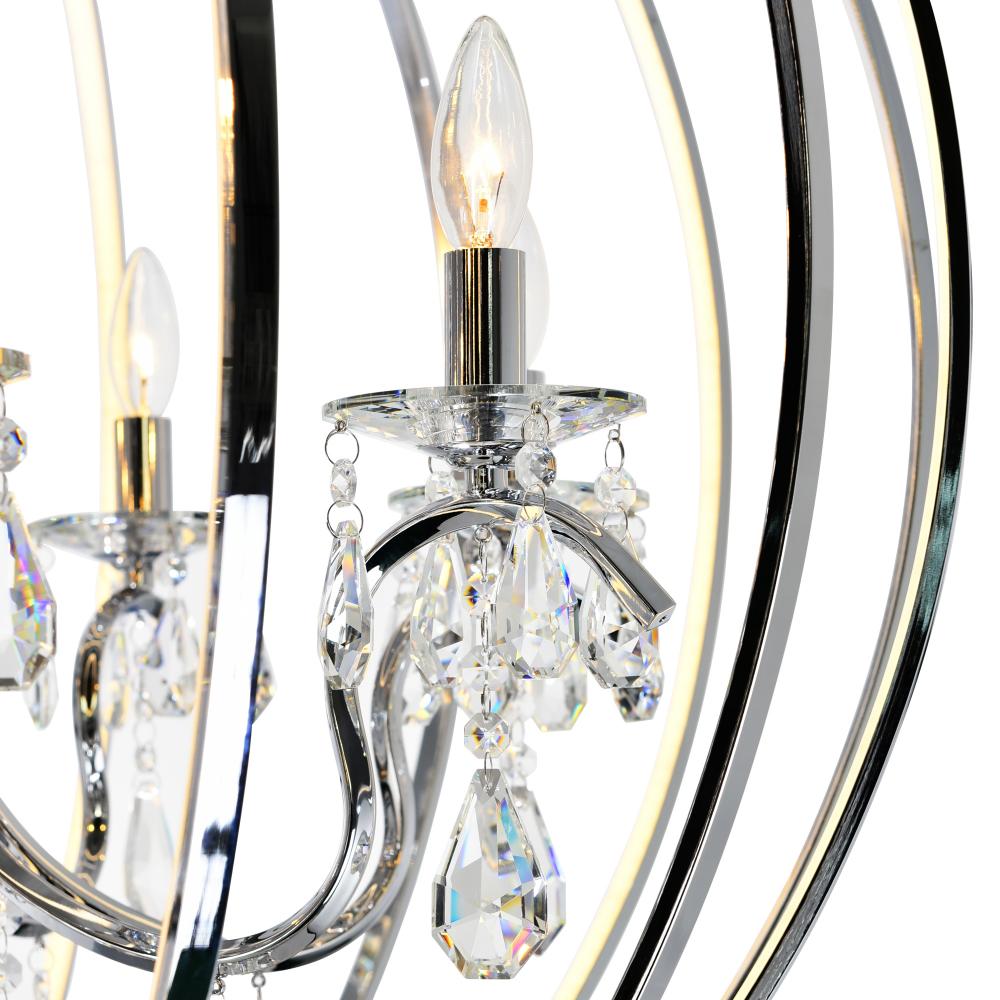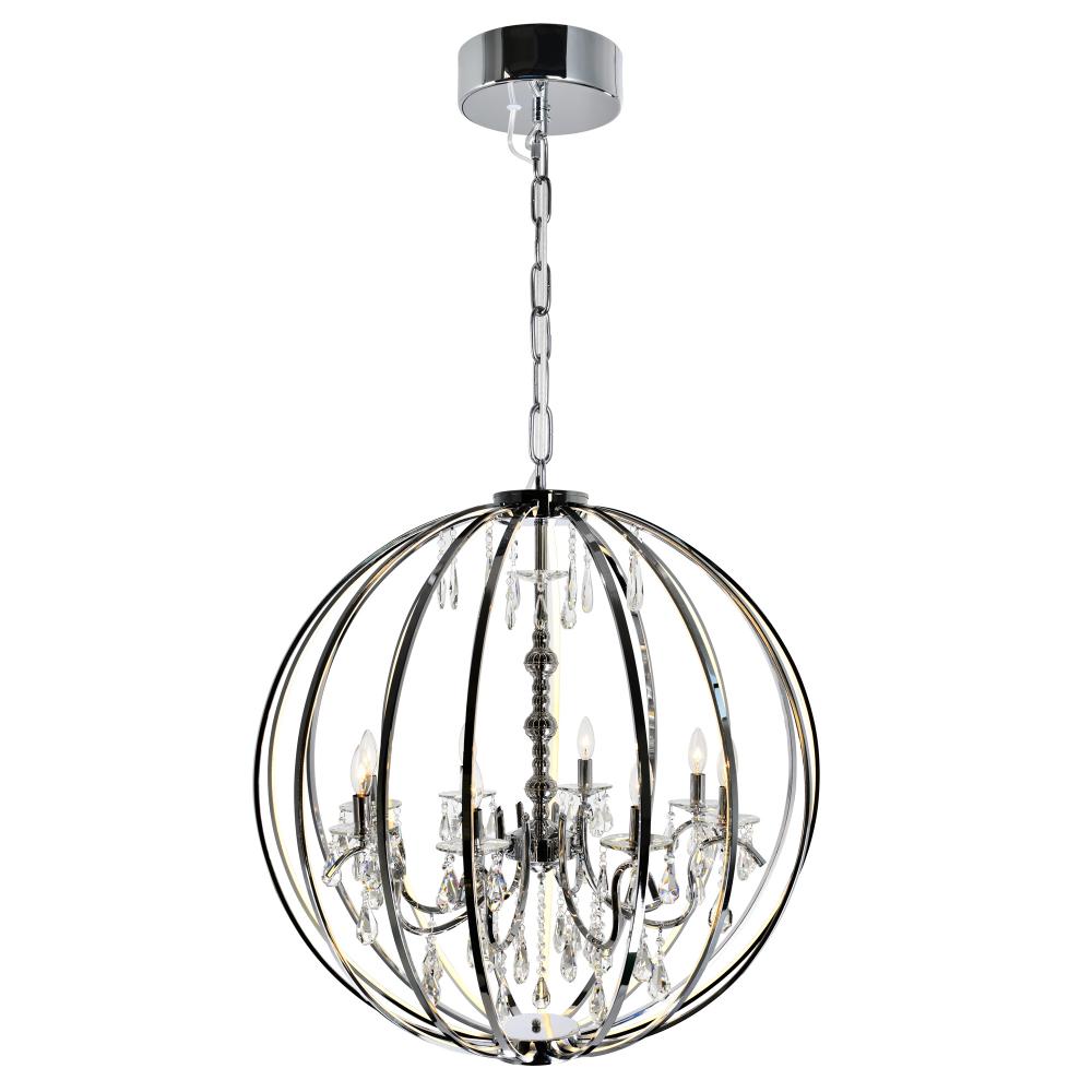 An oversized ball of character. The Abia 8 Light Chandelier stands out with its distinctive form. A 35 inch chrome orbit houses an eight-arm candelabra frame embellished with dangling crystals. This light fixture delivers cozy, warm light while displaying