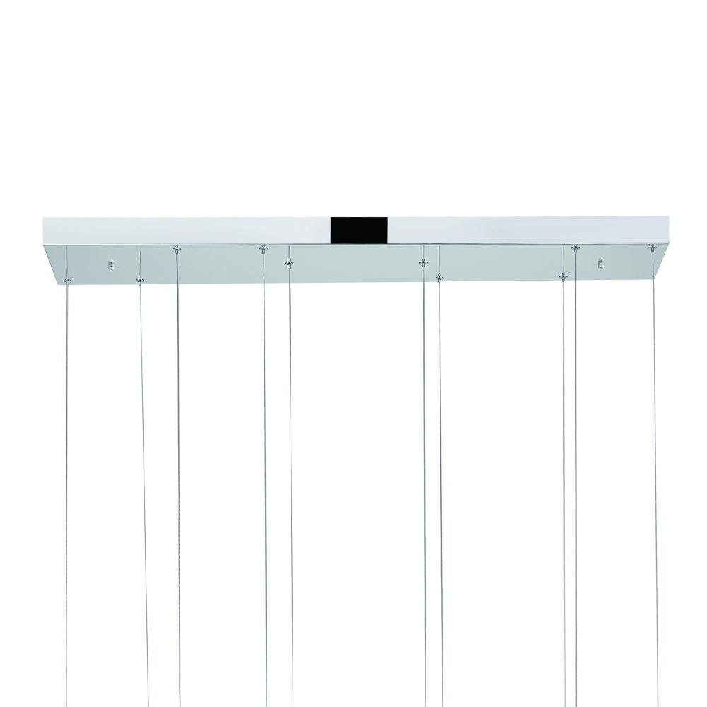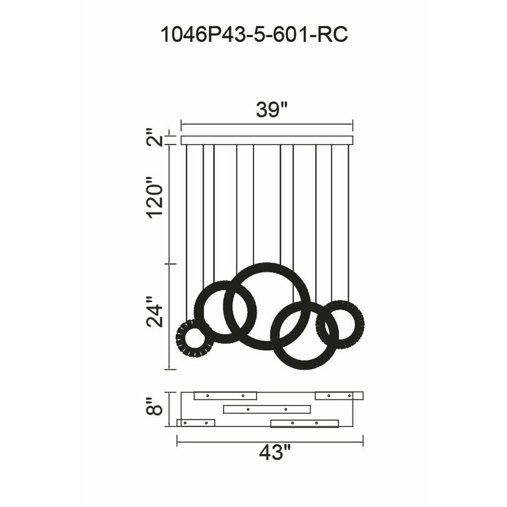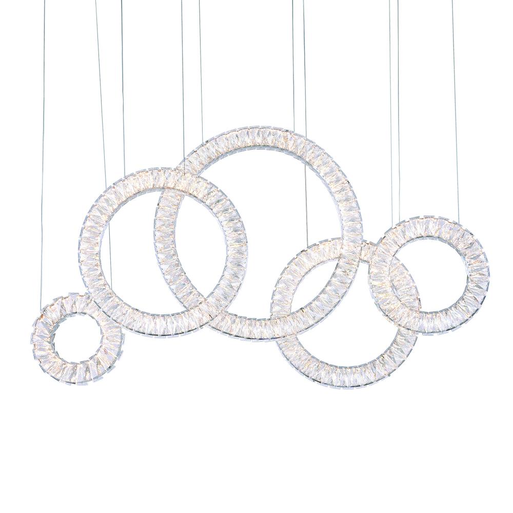 The 43 inch Celina LED Chandelier Pool Table/Island Light would make a fine focal point in itself even when unlit. This oversized pendant light features five interlocking rings wrapped in glittering crystals. A rectangular chrome canopy holds the ring in p
