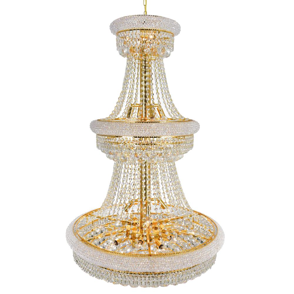 Three tiers, crystal drapings, and candelabra bulbs make up this light source. But it isn't as simple as that. This large down chandelier has elegance all over it. The grandiose presentation of all the elements that make up this Empire 32 Light Chandel
