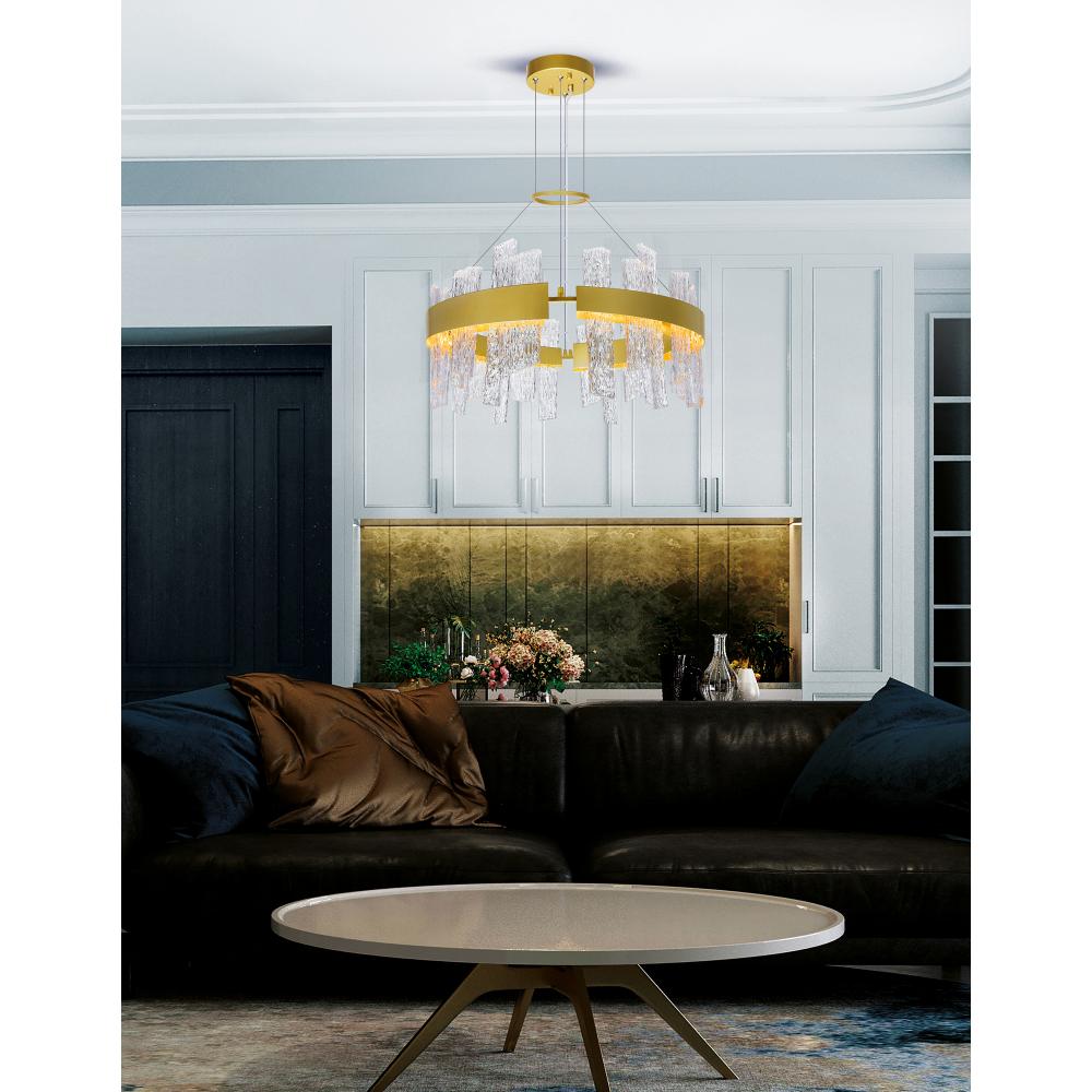 A great choice for many different rooms, the Guadiana Satin Gold 24 inch LED Chandelier packs a major style punch. It has the perfect style contrast given the black metal and clear glass material plus the combination of straight lines and curves. This mode