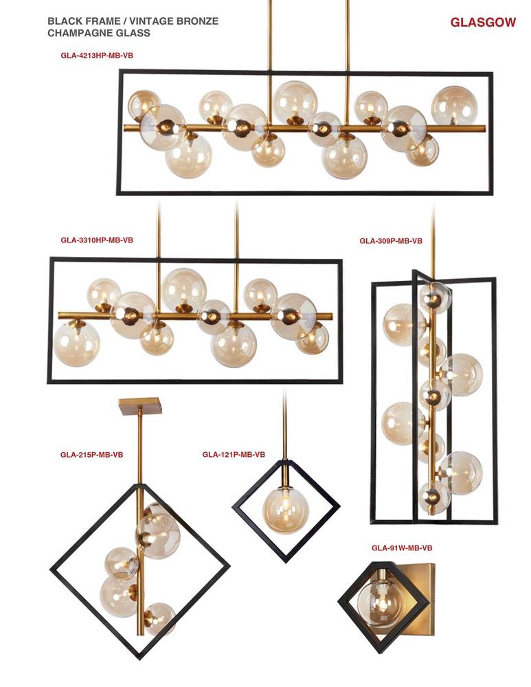 Based on the eye-catching contrast between a linear frame and reflective glass globes bulbs, the Glasgow family of lighting takes the concept in unexpected directions and arresting configurations sure to garner attention. The linear metal frame and globe lights come in a choice of color/finish combinations from warm to dramatically stylish. It’s a look that adds both visual and textural contrast. With both vertical and horizontal, simple and elaborate designs available, Glasgow lighting adds a unifying sense of opulent style to your home.
