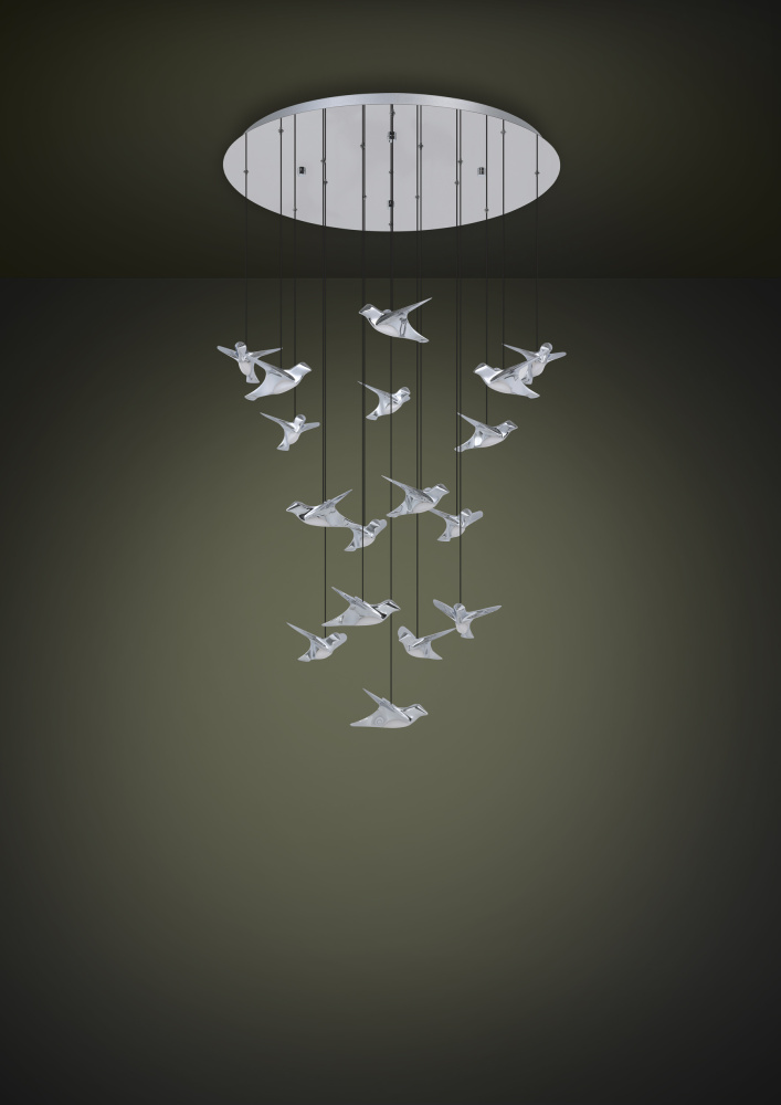 17 LT LED Cascaded Pendant w/ Chrome Finish & Chrome Bird Shaped Shades w/ Acrylic Diffusers
