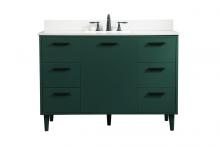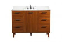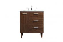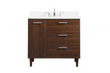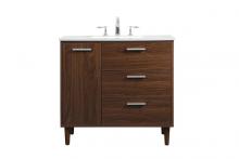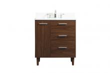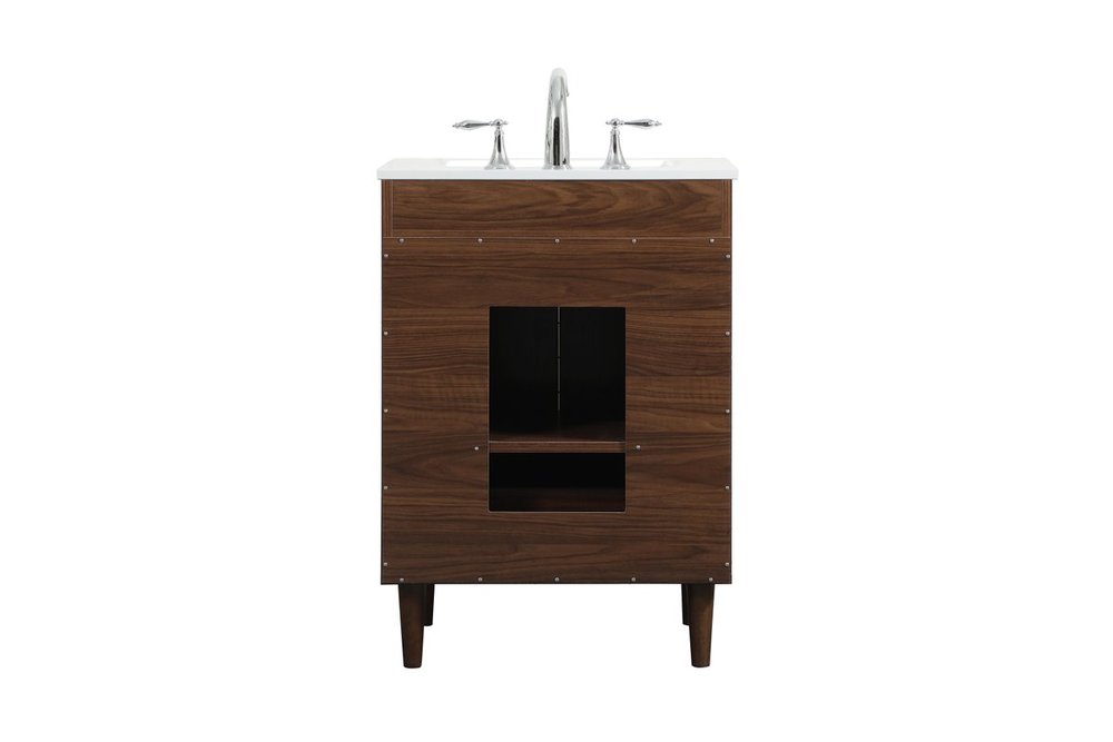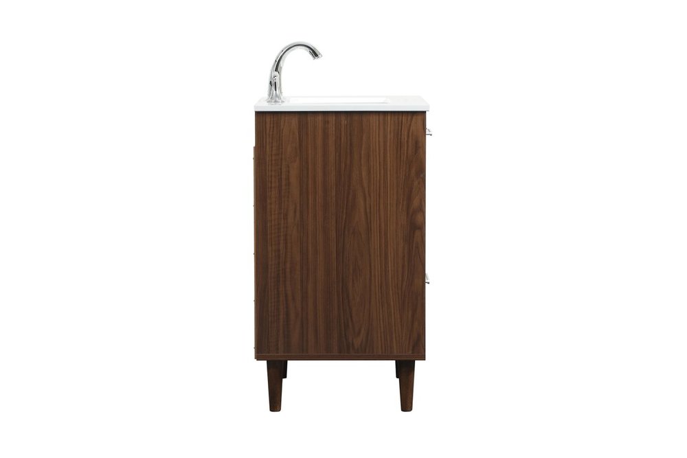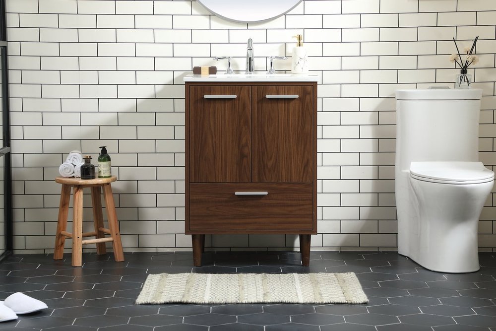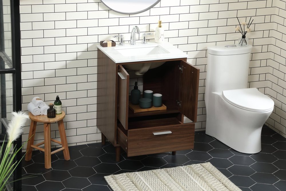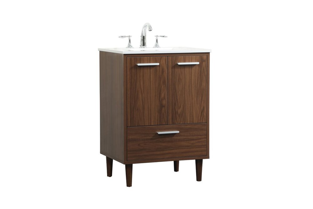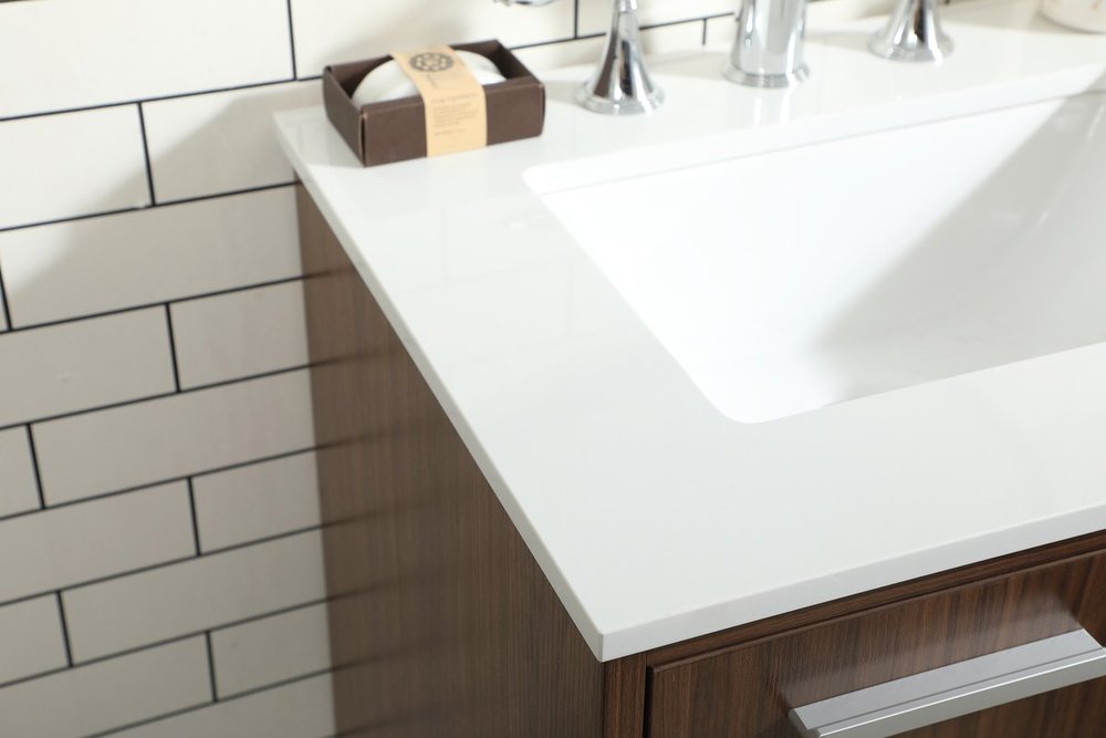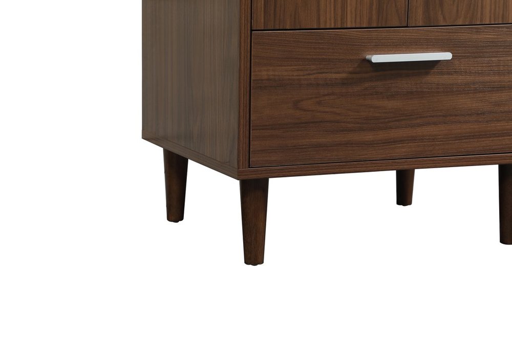 Modern sophistication is defined with the walnut finish and silver barpulls of this vanity and slender tapered legs. Its length makes it the perfect addition to any sized home, and saves space with its storage area hidden behind the double cabinet doors and one bottom drawer. Topped with a highly durable engineered stone countertop and a porcelain undermount sink, this modern design will become your focal point of your bathroom or powder room. Equipped with soft-closing drawer and doors adds a quiet functional touch.