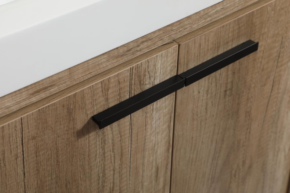 Modern sophistication is defined within the wood finish look and black barpulls of this vanity. Its length makes it the perfect addition to any sized home, and saves space with its storage area hidden behind the double cabinet doors and one bottom drawers. Topped with a highly durable thick resin white counter top and an integrated sink, this modern design will add everlasting class to your bathroom and powder room.