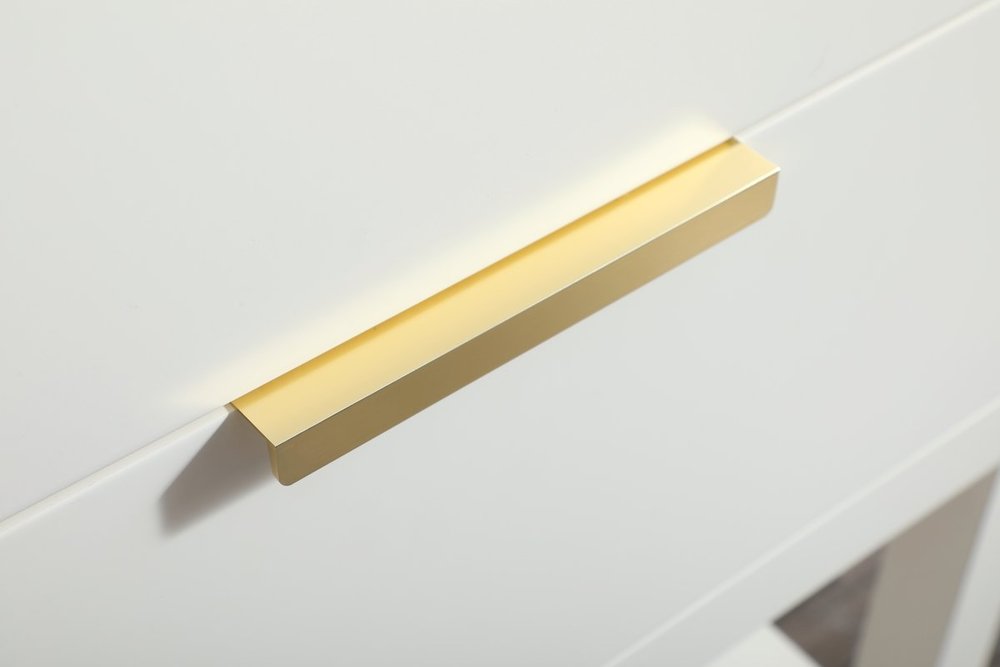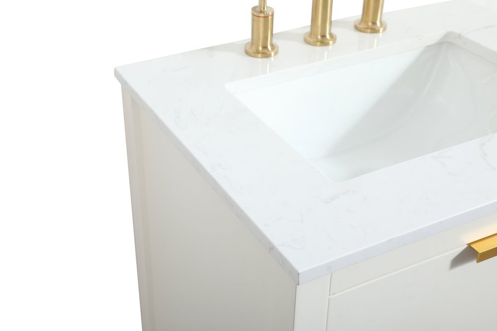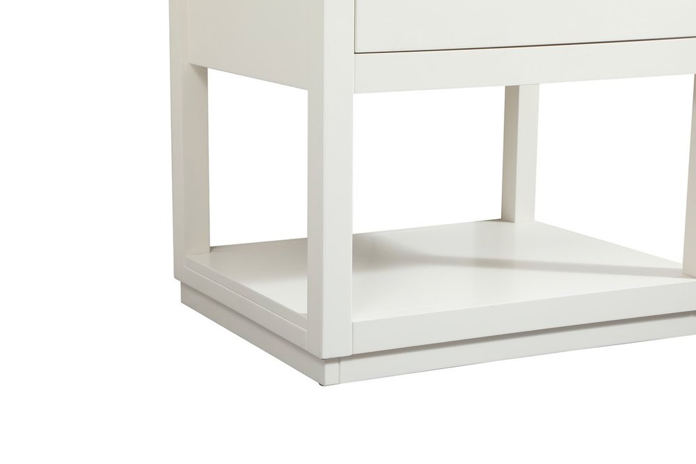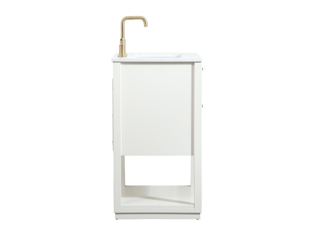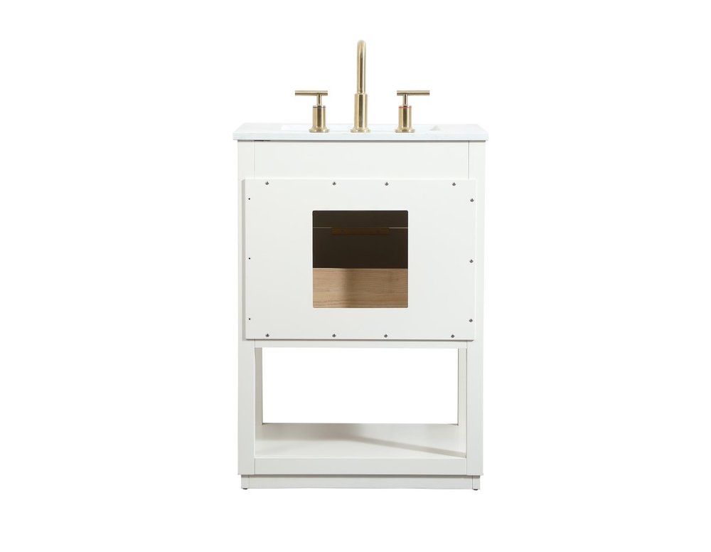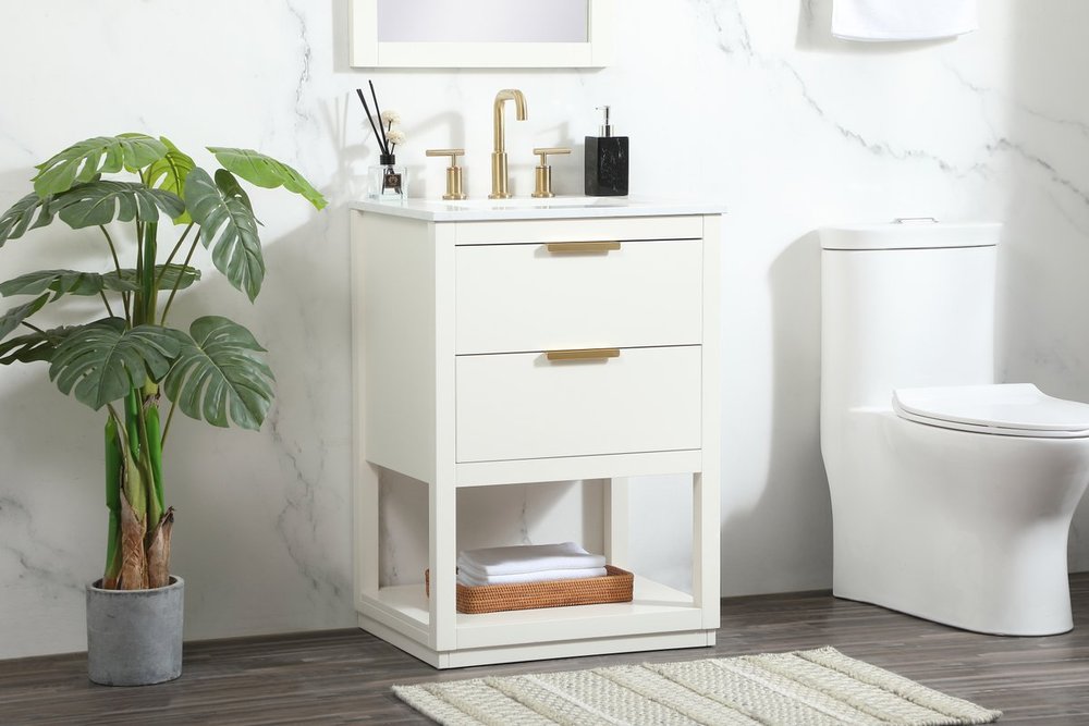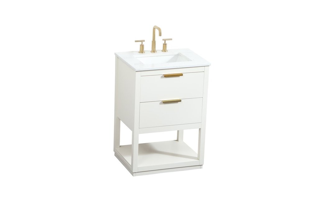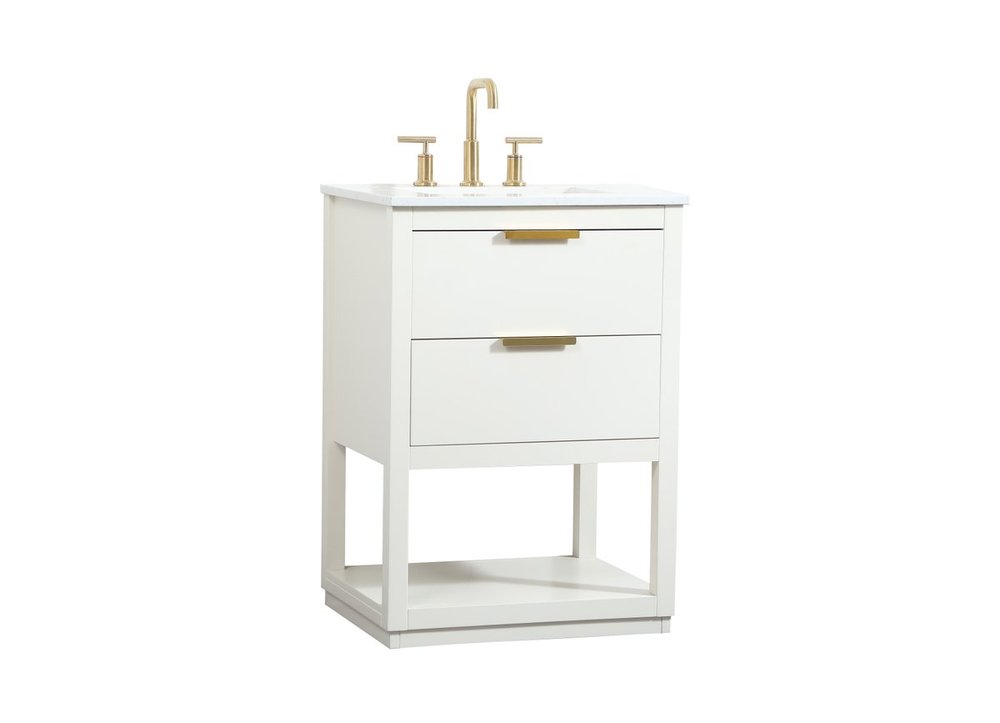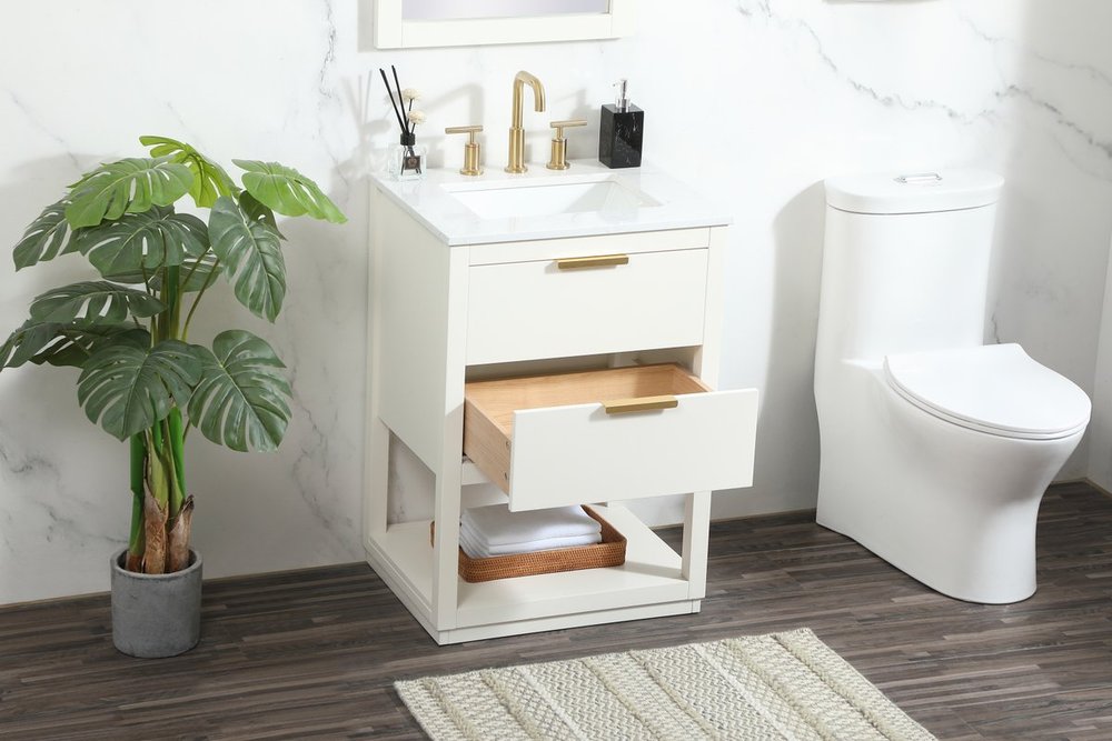 Live in modern comfort with this 24" white finish vanity. Dressed in a white and sleek gold metal hardware, its contemporary style will have your bathroom or powder room elevated in modern sophistication. The open shelf at the base and one drawer reveal ample storage space for your bathroom essentials and miscellany. Clean lines create its own visual interest, adding trendy looks to your already chic room.
