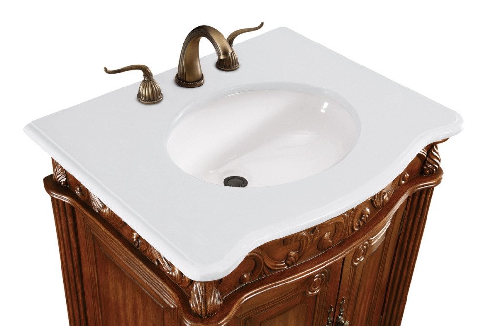 This superb balance of timeless tradition and opulent beauty in a engineered marble-topped vanity will certainly enhance the aesthetics of any home or office bathroom! Featuring an ivory white durable engineered marble countertop complimenting the hand painted cabinet with a delicate carved floral design, stands on stylishly carved solid wood French scroll feet. Don't let the design fool you, the engineered marble countertop and porcelain undermount sink allows for space to get ready, while the antique bronze hardware allows you to discover storage spaces with ease. You and your guests will marvel at this vanity that will both store away your bathroom essentials and enhance the aesthetics of your room.