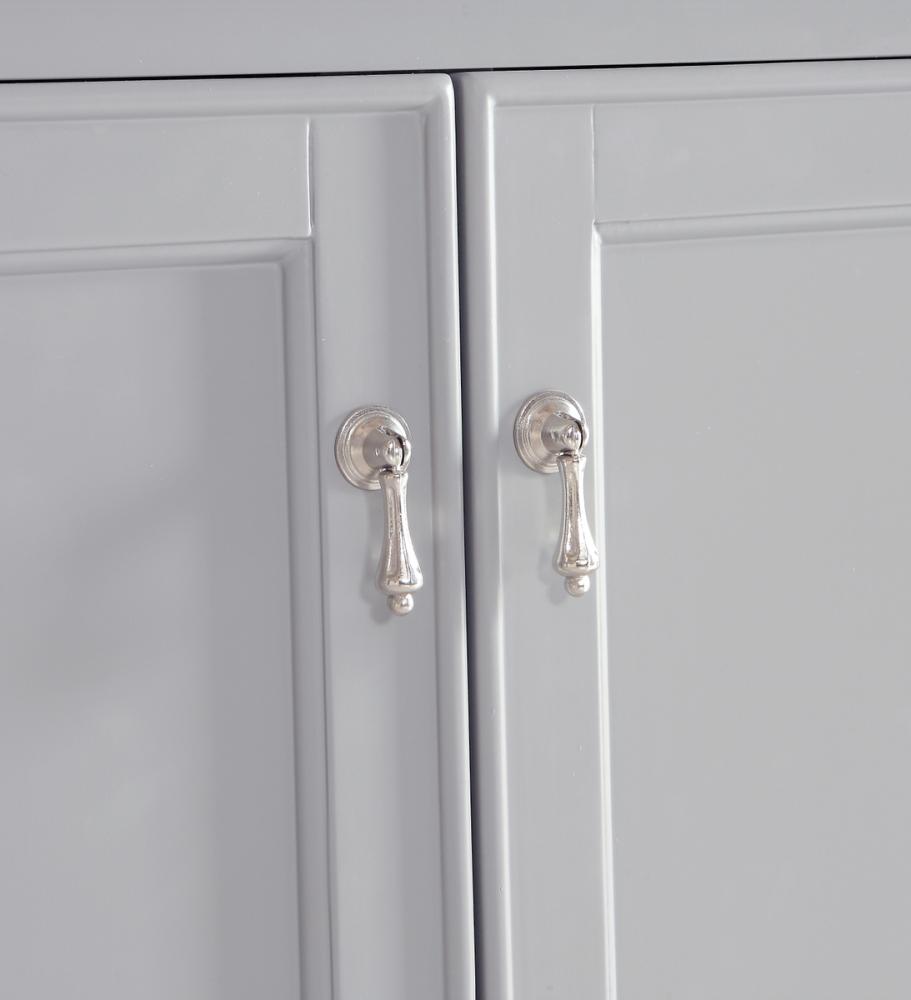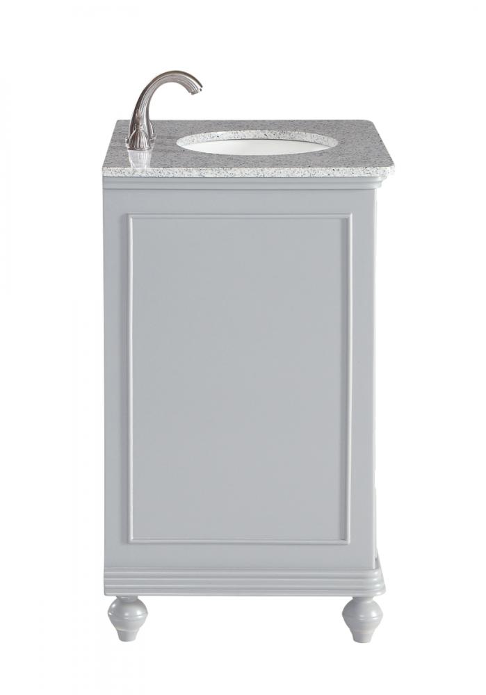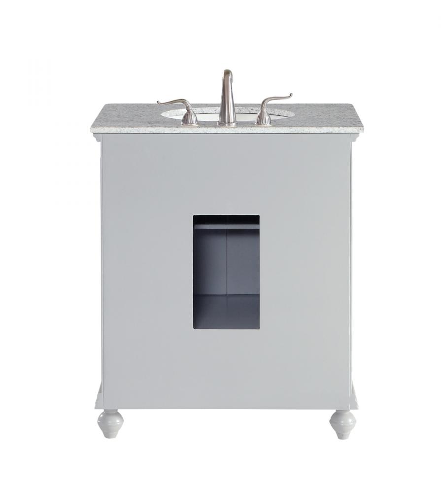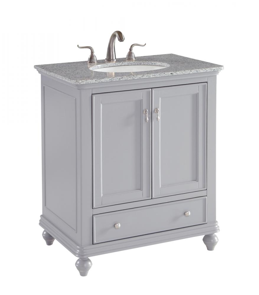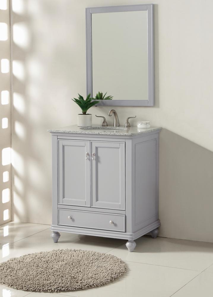 A sleekly styled 2 door, 1 drawer granite-topped bathroom vanity like this can only bring a smile of appreciation for its simple beauty and clean lines. With an authentic Kashmir white granite counter top, oval white porcelain sink, hand painted soft grey cabinet, 2 soft-close doors and a drawer, brushed steel hardware, carved bun feet, this elegant, transitional vanity balances form and function. Measurements: W30”xD21”xH35”