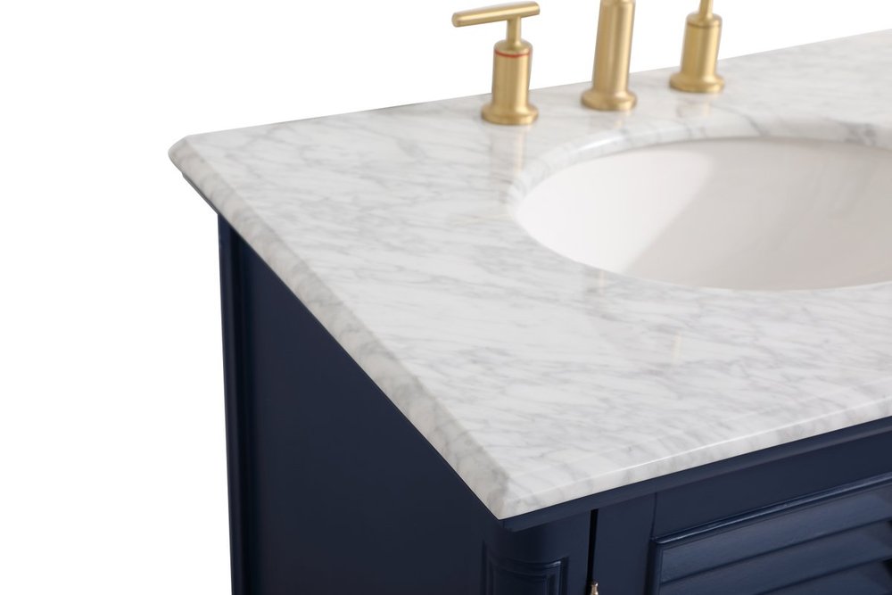 A small space doesn't mean you have to settle for less. The Rhodes collection compact vanity will add lovely sophistication and complement any small bathroom or powder room, while utilizing its charm and function to provide you with ample storage spaces. Metal round knobs gently adorn the shuttered cabinet door and drawer at the base, allowing for you to store away your bathroom essentials. The Carrara white marble countertop, porcelain undermount sink, dignified subtle engravings on the side edges, and rounded legs all come together to create contemporary beauty. Work with your space, and design a beautiful room, no matter the size.