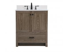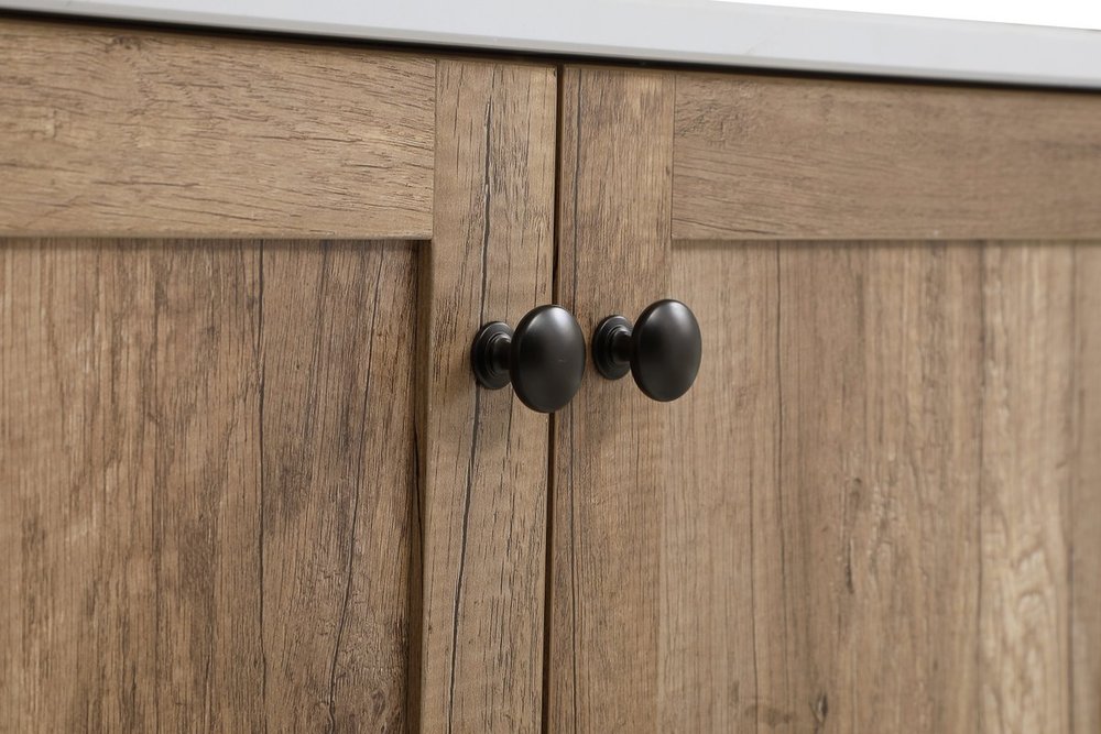 Delve into a world of minimalistic fashion and contemporary styling with this farmhouse 30" vanity. The clean faux lines anchors the weathered design. Black handle adorns the two doors hiding the base of the integrated porcelain sink while the bottom drawer allows you to store your bathroom necessities and toiletries. The compact size makes it the perfect vanity for any bathroom or powder room, regardless of size. Comes with a matching backsplash to complete the look and protects your wall.
