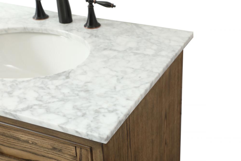 Comes with an undermount porcelain sink and a carrara white marble countertop