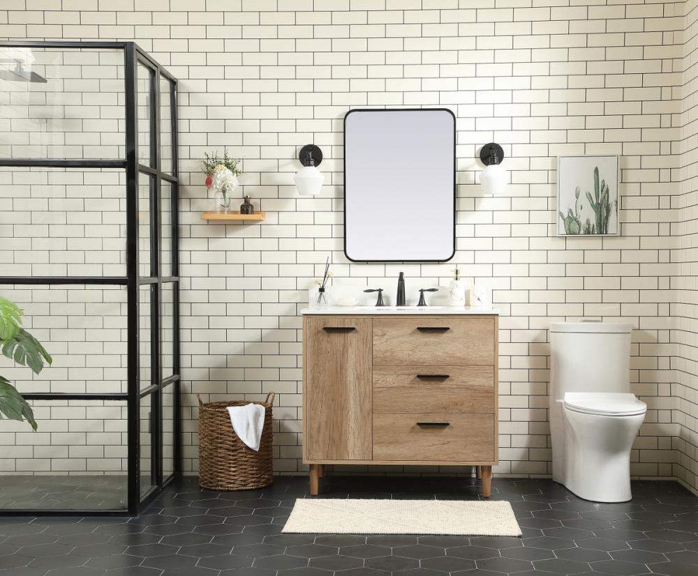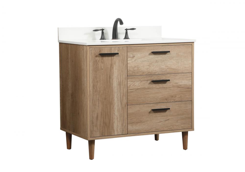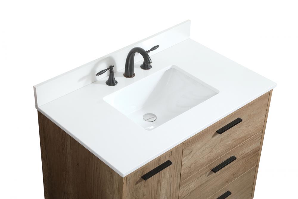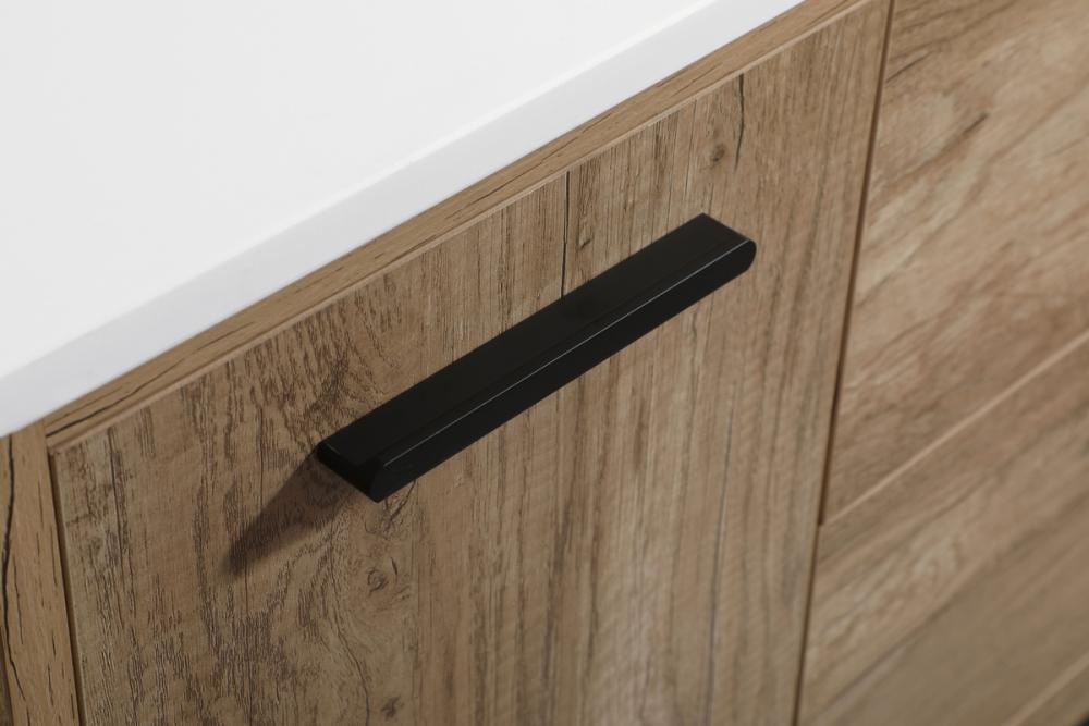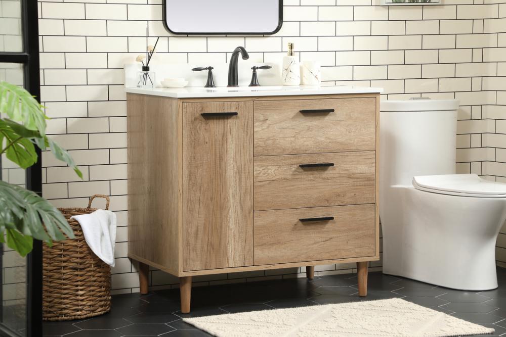Exquisite modern sophistication is defined with the wood look and black barpulls of this vanity and slender tapered legs. Its length makes it the perfect addition to any sized home, and saves space with its storage area hidden behind the Single cabinet doors and two functional drawers. Topped with a highly durable engineered marble countertop and a porcelain undermount sink, this modern design will become your focal point of your bathroom or powder room. Equipped with soft-closing drawer and doors adds a quiet functional touch. Comes with a matching backsplash to complete the look and protects your wall.